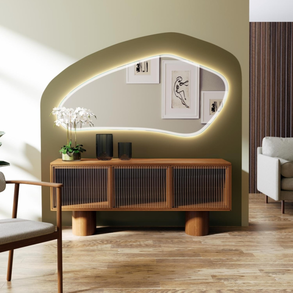 - Асимметричная форма: Неправильный контур с плавными изгибами добавляет динамики и эксклюзивности. Это зеркало не подчиняется строгой геометрии — оно живое, современное и идеально вписывается в интерьеры в стиле лофт, сканди или эклектика.