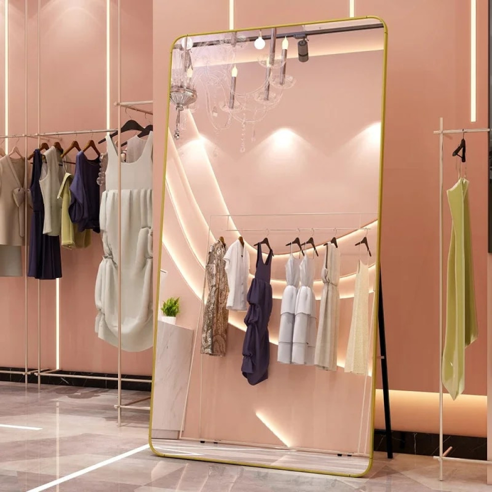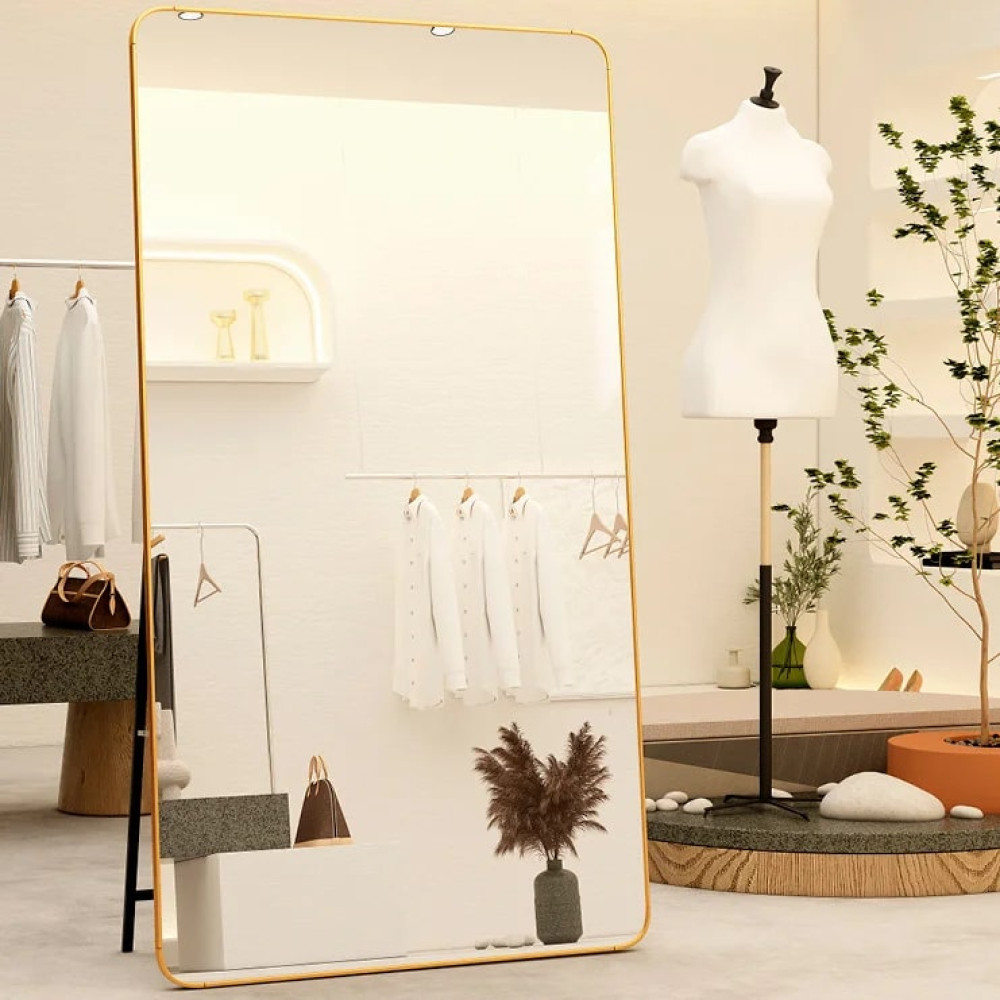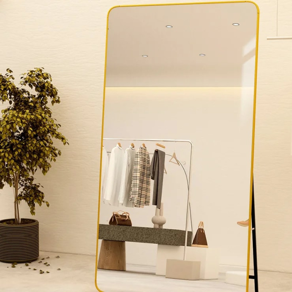 Зеркало MM022 — роскошное напольное зеркало в полный рост, выполненное в изысканной золотой раме из МДФ с плавно закруглёнными углами. Оно установлено на прочную опору-ножку, что позволяет легко разместить его в любом месте комнаты без монтажа на стену.