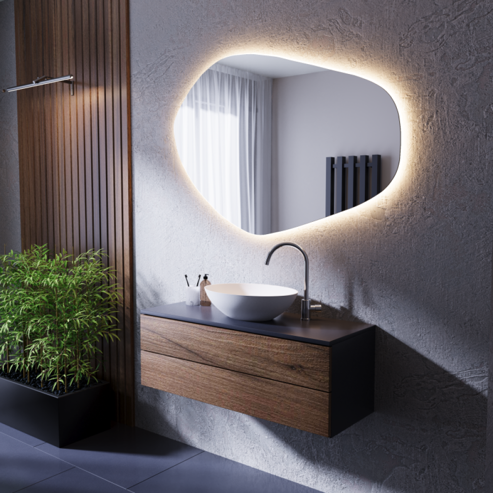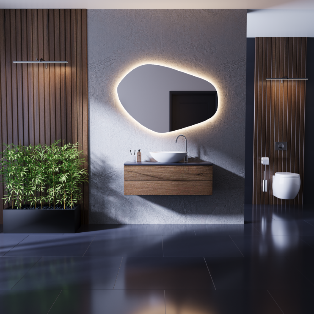 Зеркало ASM002 — это дизайнерское решение, которое не просто выполняет утилитарную функцию, но становится центром эстетического внимания. Асимметричный контур, плавные линии и интегрированная LED-подсветка создают ощущение динамики, лёгкости и визуального обаяния.
