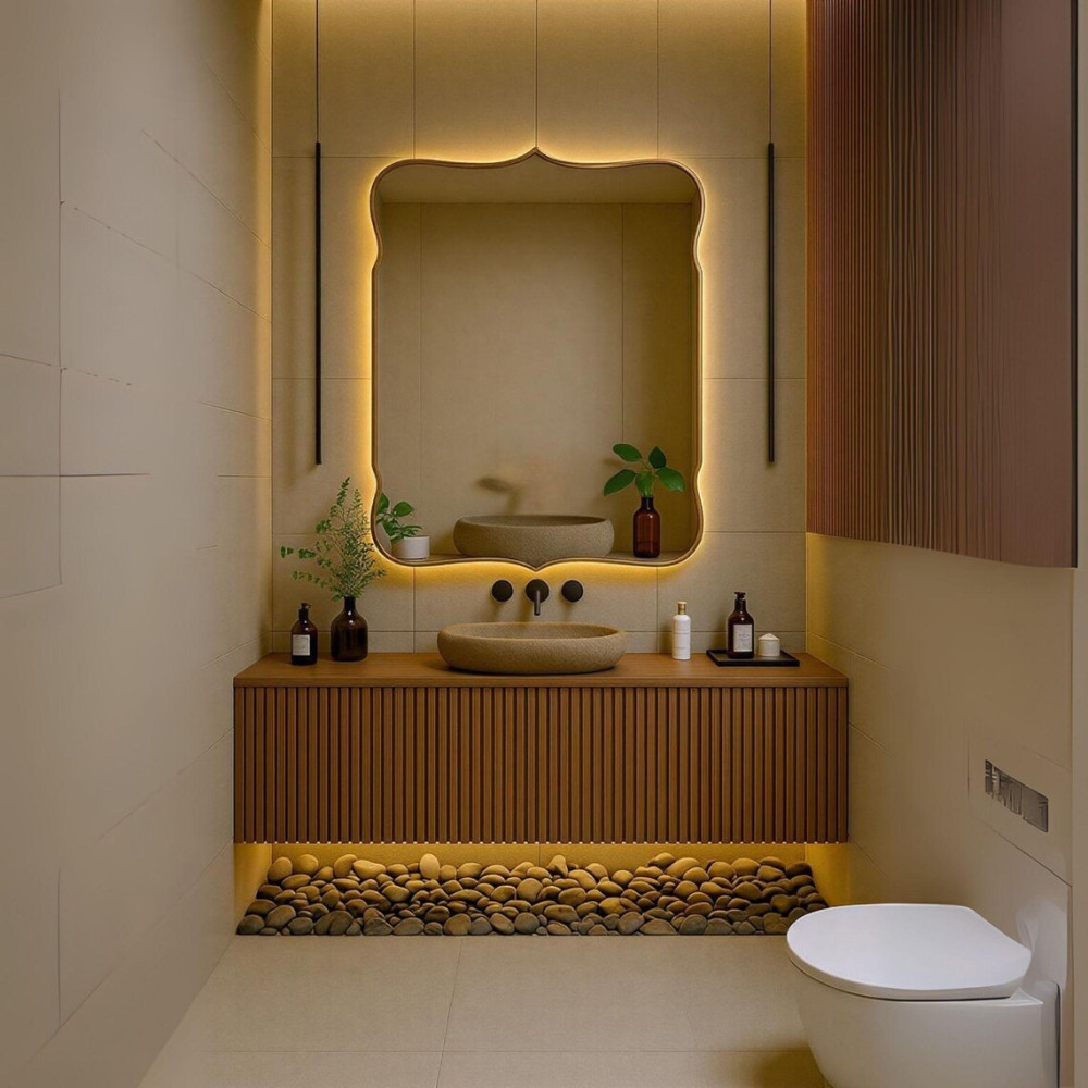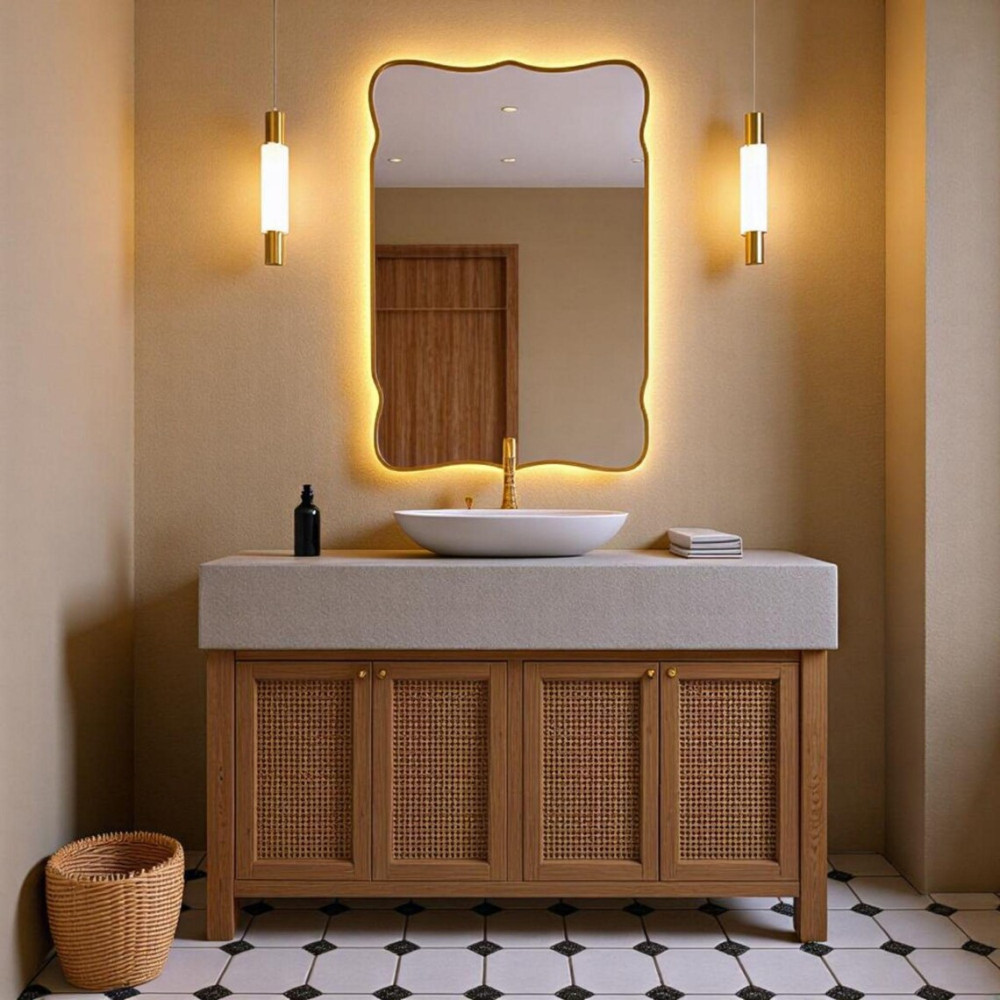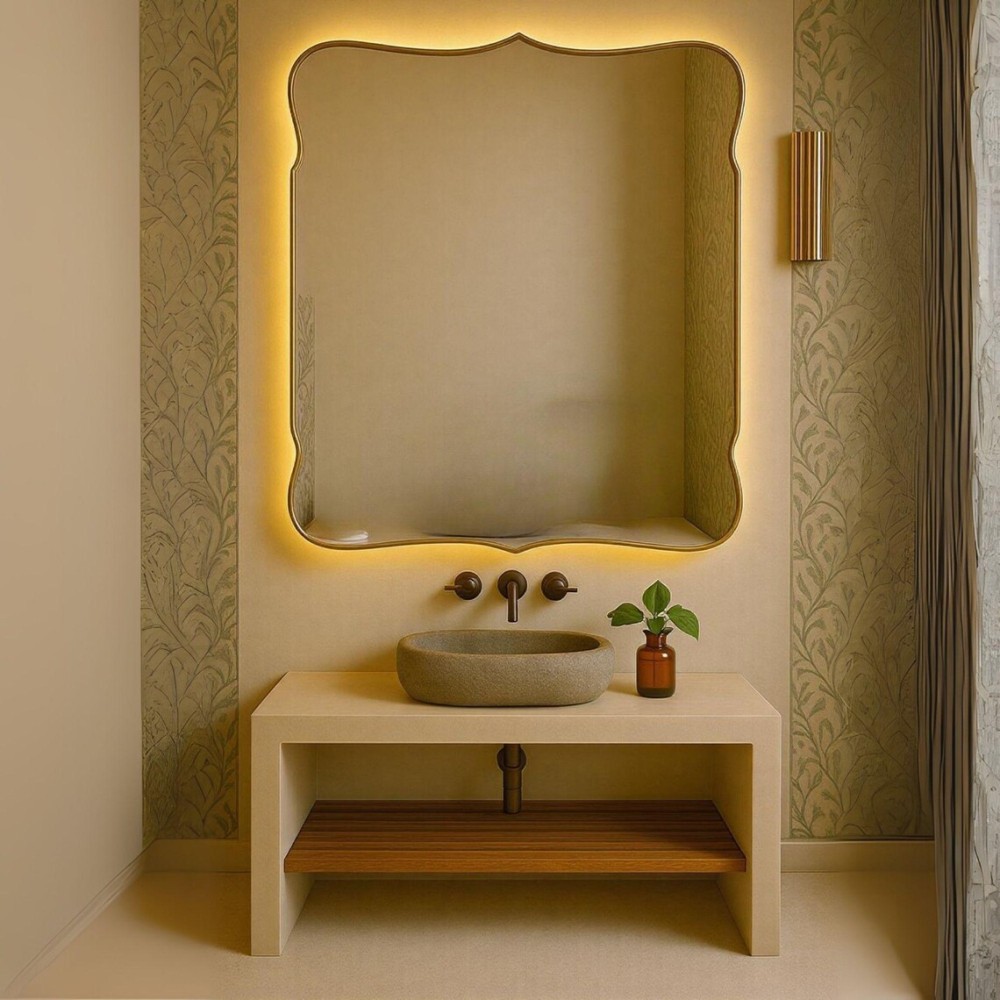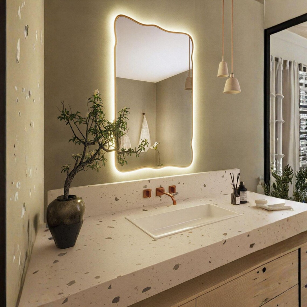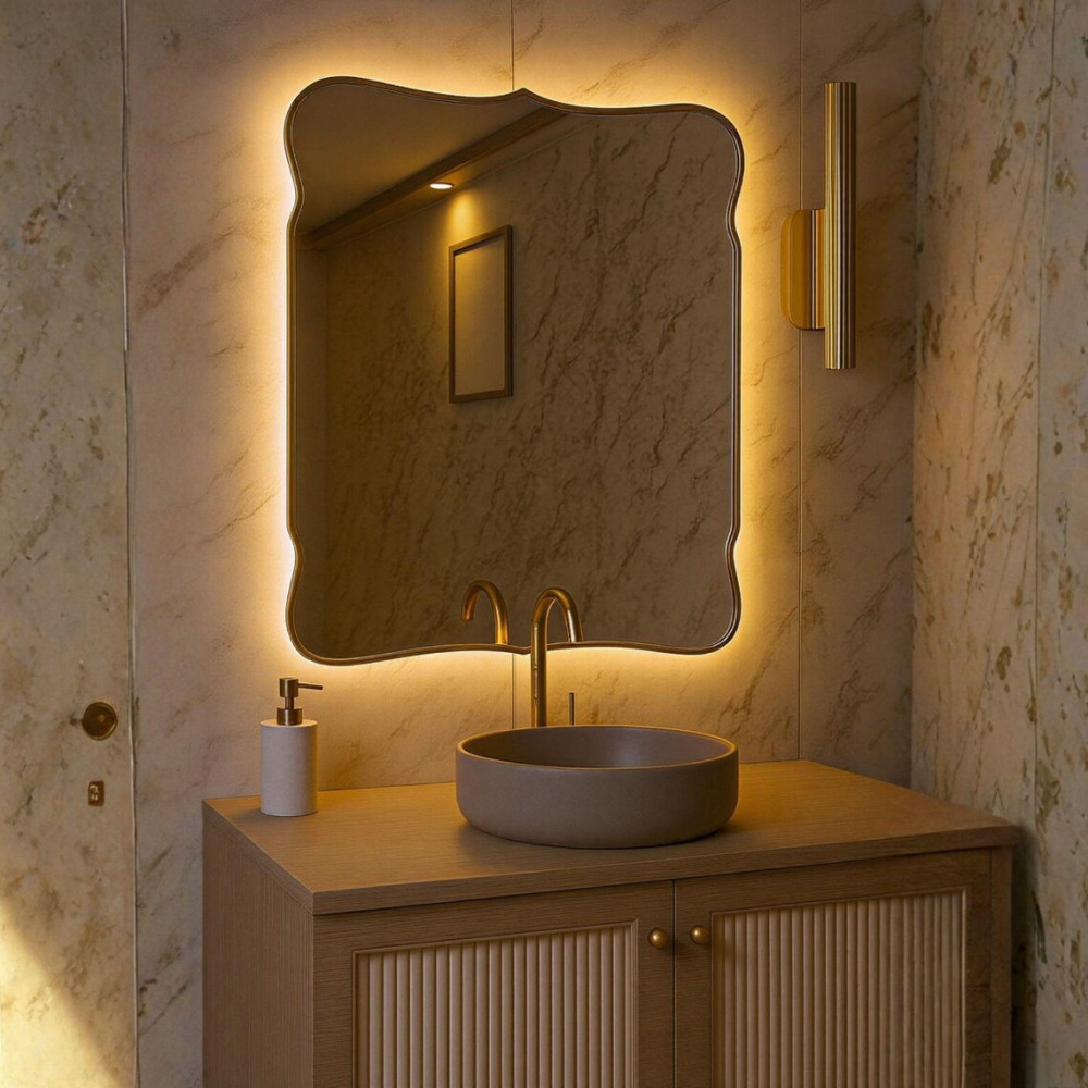 Зеркало E064 — эффектное сочетание необычной формы, выразительной рамы и мягкого светового акцента. Его фигурный силуэт придаёт интерьеру динамику и индивидуальность, а рама из МДФ подчёркивает контуры зеркала, добавляя структуру и стиль в оформление помещения.