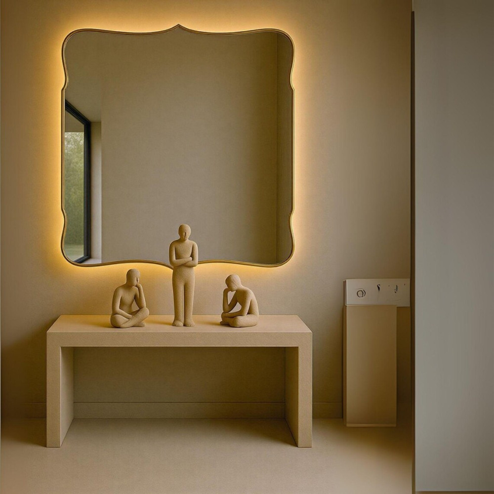 Задняя фоновая LED-подсветка создаёт мягкое рассеянное свечение и эффект парения, благодаря которому зеркало становится не только функциональным, но и декоративным световым элементом.