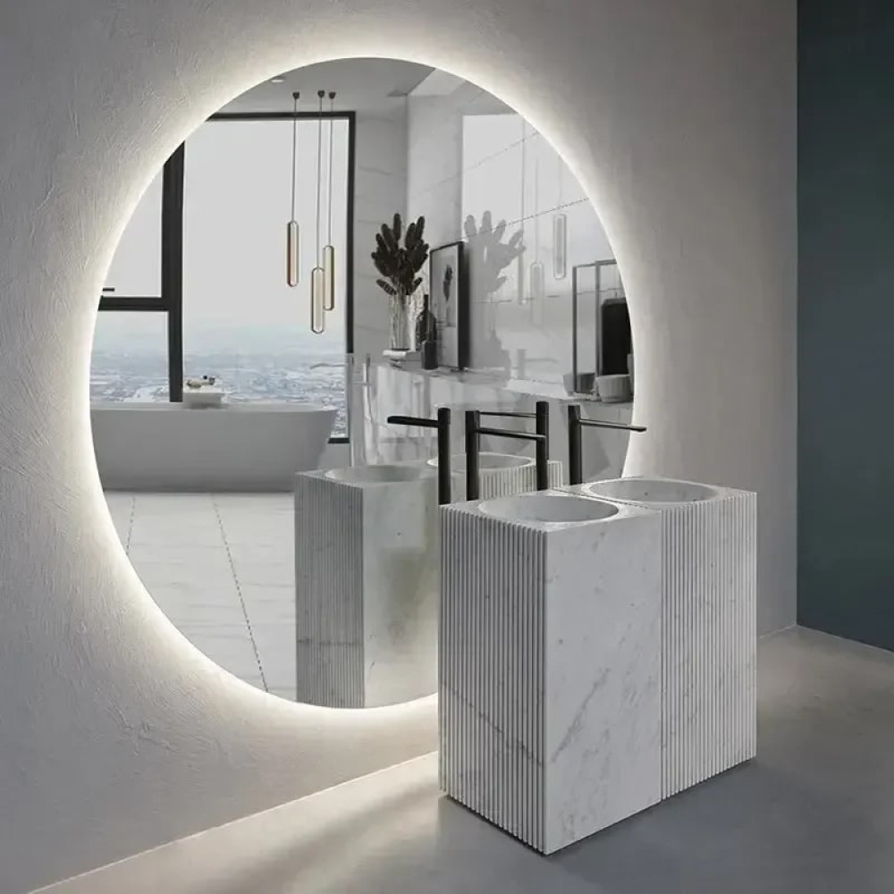 Круглое большое зеркало с задней декоративной подсветкой - это стильный и функциональный элемент интерьера, который станет ярким акцентом в вашем доме.