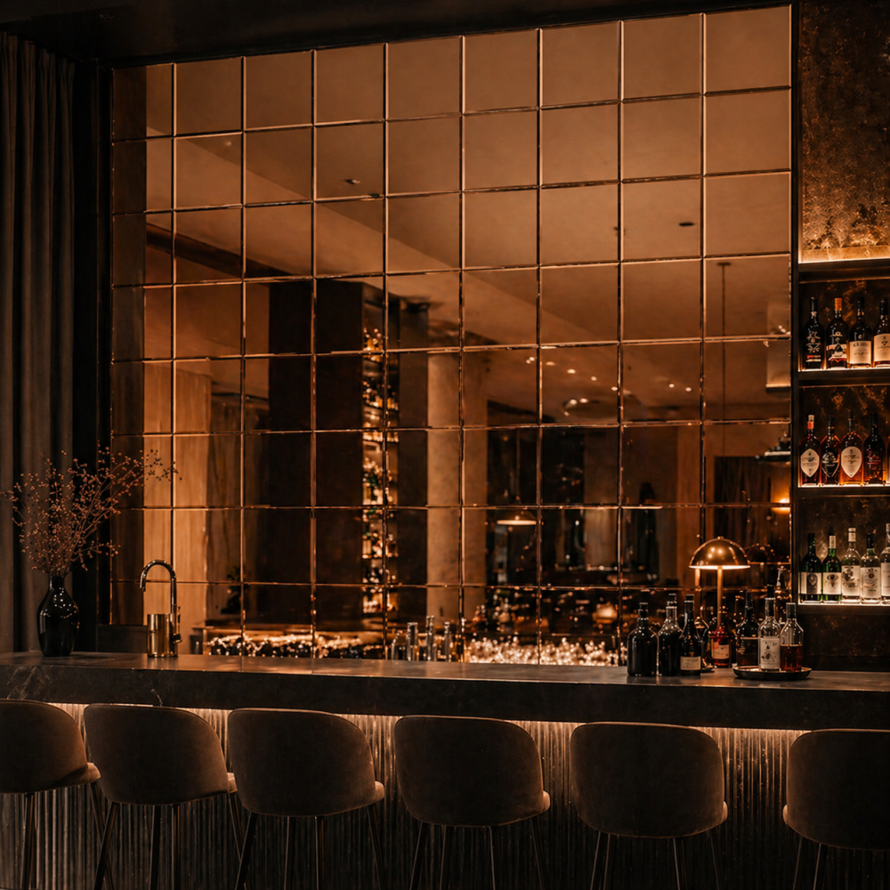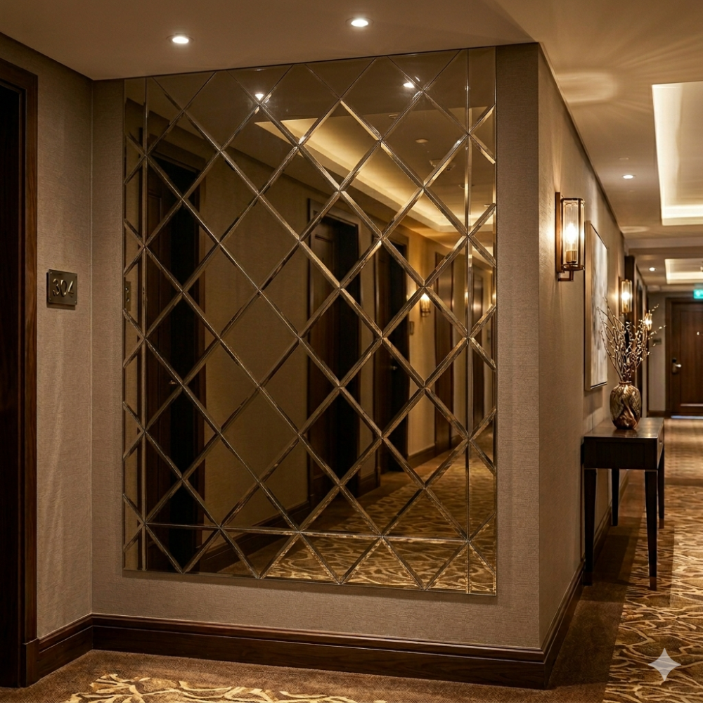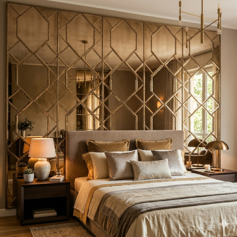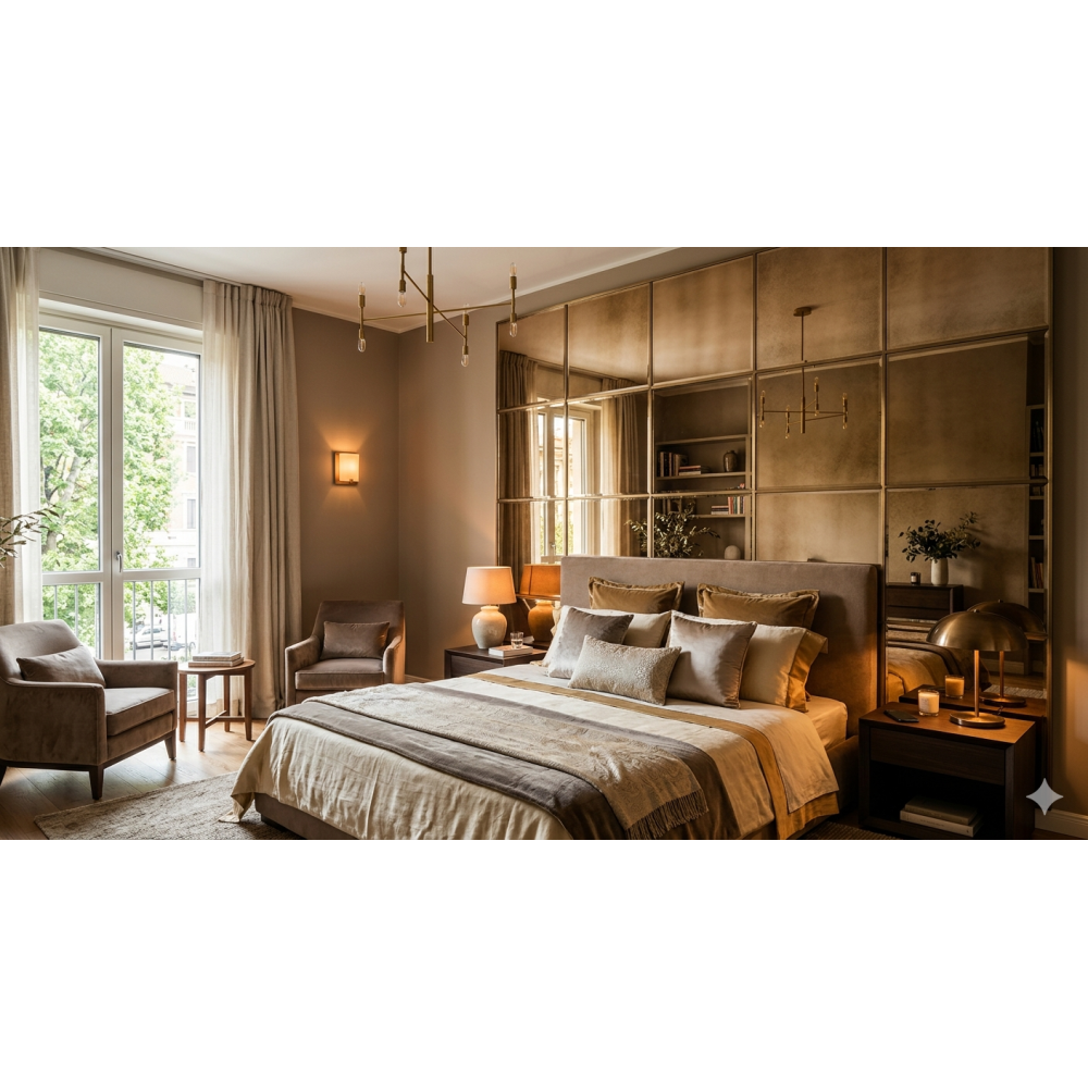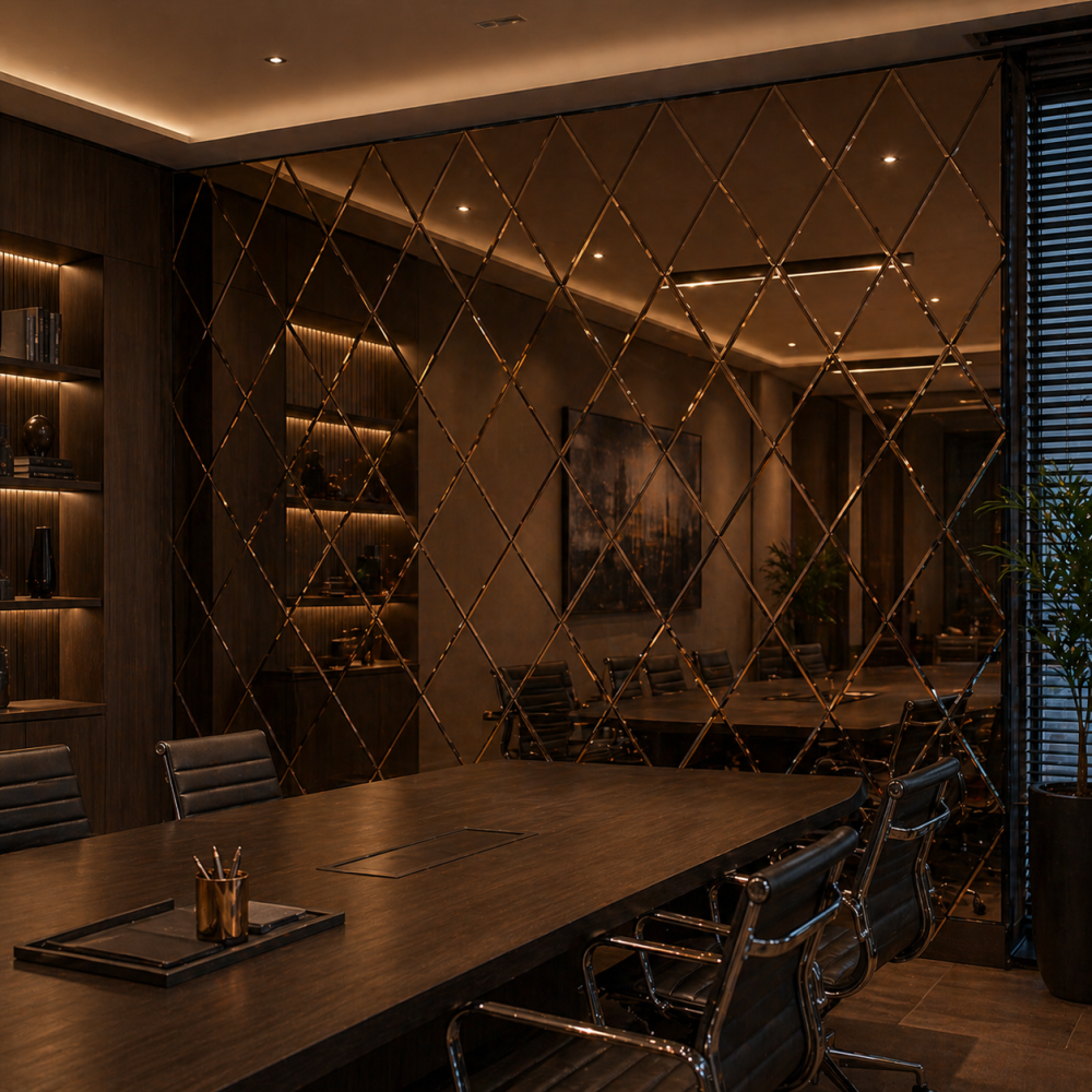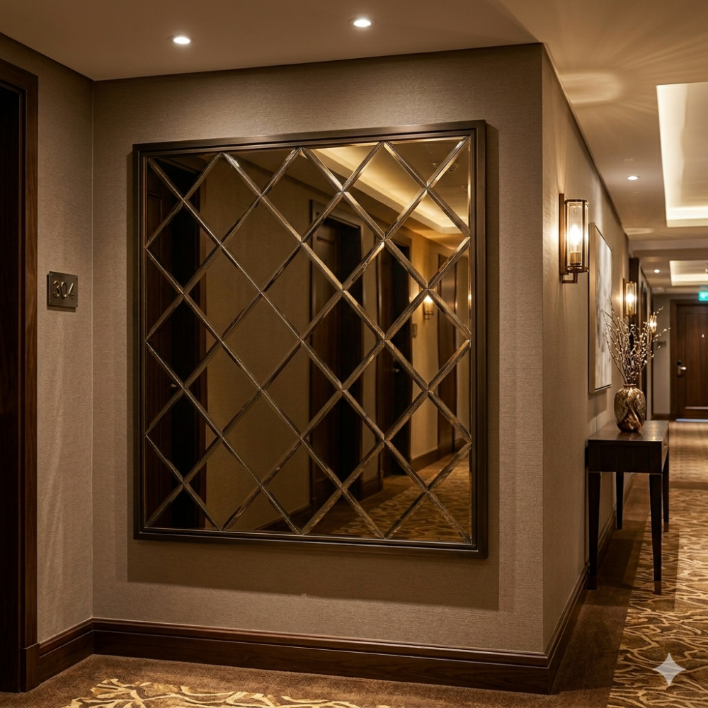 Бронзовое зеркальное панно — это один из самых эффективных инструментов в арсенале дизайнера для создания роскошного и глубокого интерьера. За счет теплого кофейного оттенка и игры света на гранях, такое панно превращает обычную стену в сверкающее художественное полотно, которое не перегружает пространство лишними деталями.