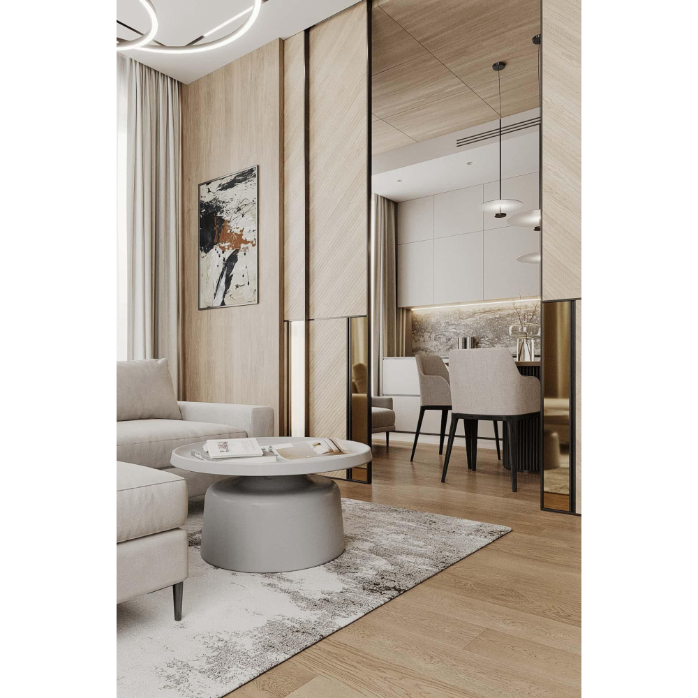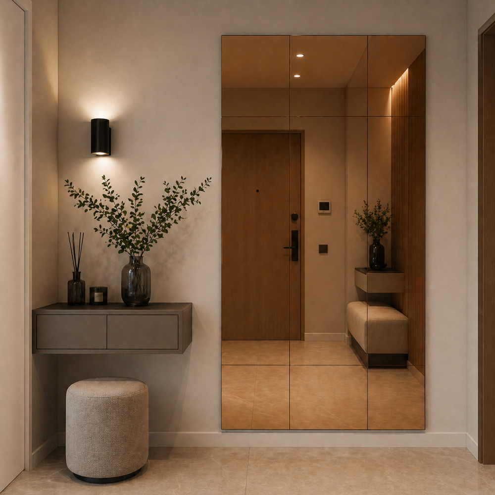 Глубина и объем: Тонированное зеркало визуально «проваливает» стену, создавая эффект дополнительного пространства, при этом скрывая мелкие бытовые детали за счет темного подтона.