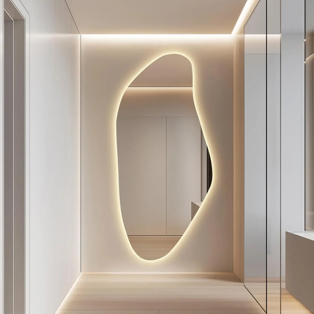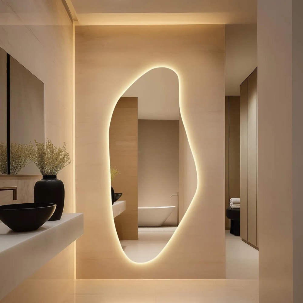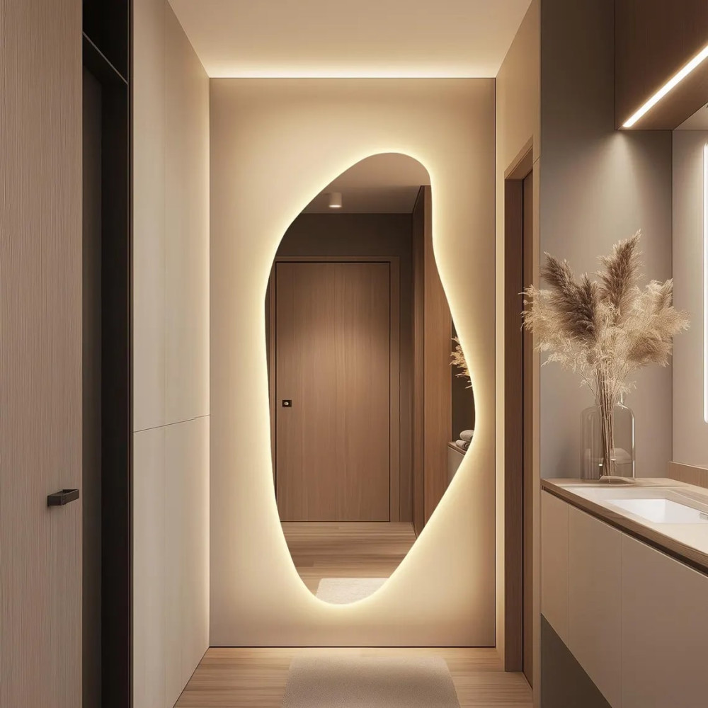Большой размер в полный рост обеспечивает максимальную функциональность и эффектность, а мягкая фоновая LED-подсветка создаёт аккуратное свечение вокруг зеркала. Такой световой ореол подчёркивает нестандартный силуэт, визуально отделяет зеркало от стены и формирует эффект лёгкого «парения».
