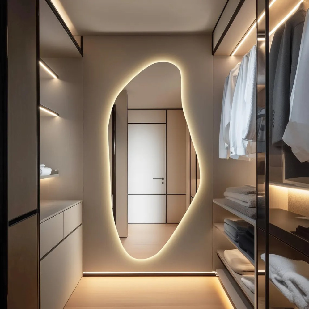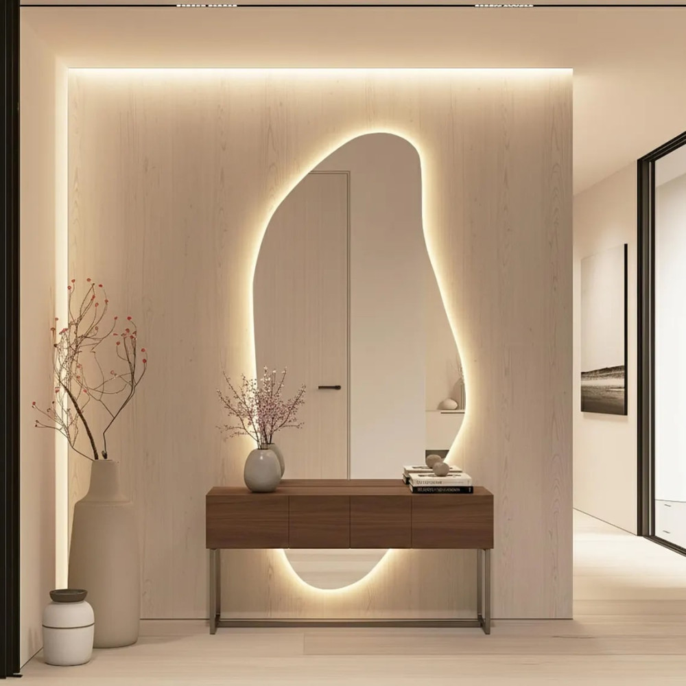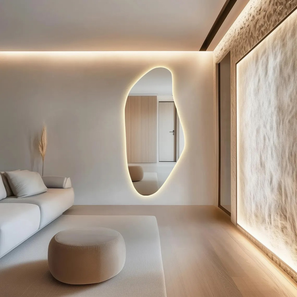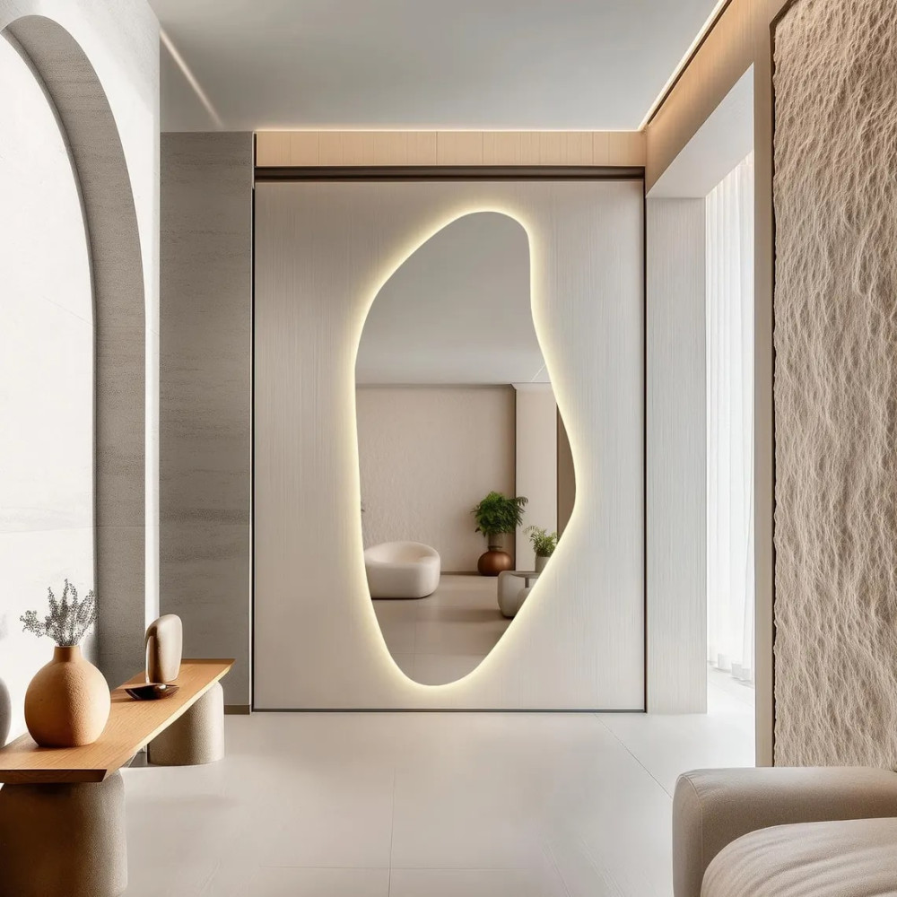 Большой размер в полный рост обеспечивает максимальную функциональность и эффектность, а мягкая фоновая LED-подсветка создаёт аккуратное свечение вокруг зеркала. Такой световой ореол подчёркивает нестандартный силуэт, визуально отделяет зеркало от стены и формирует эффект лёгкого «парения».