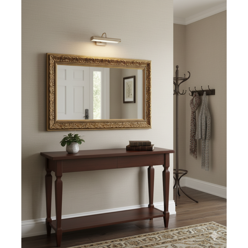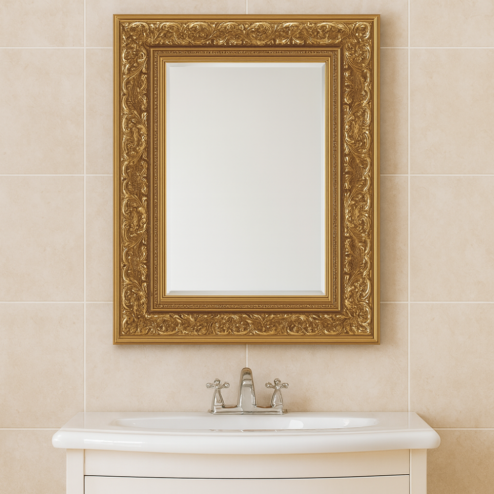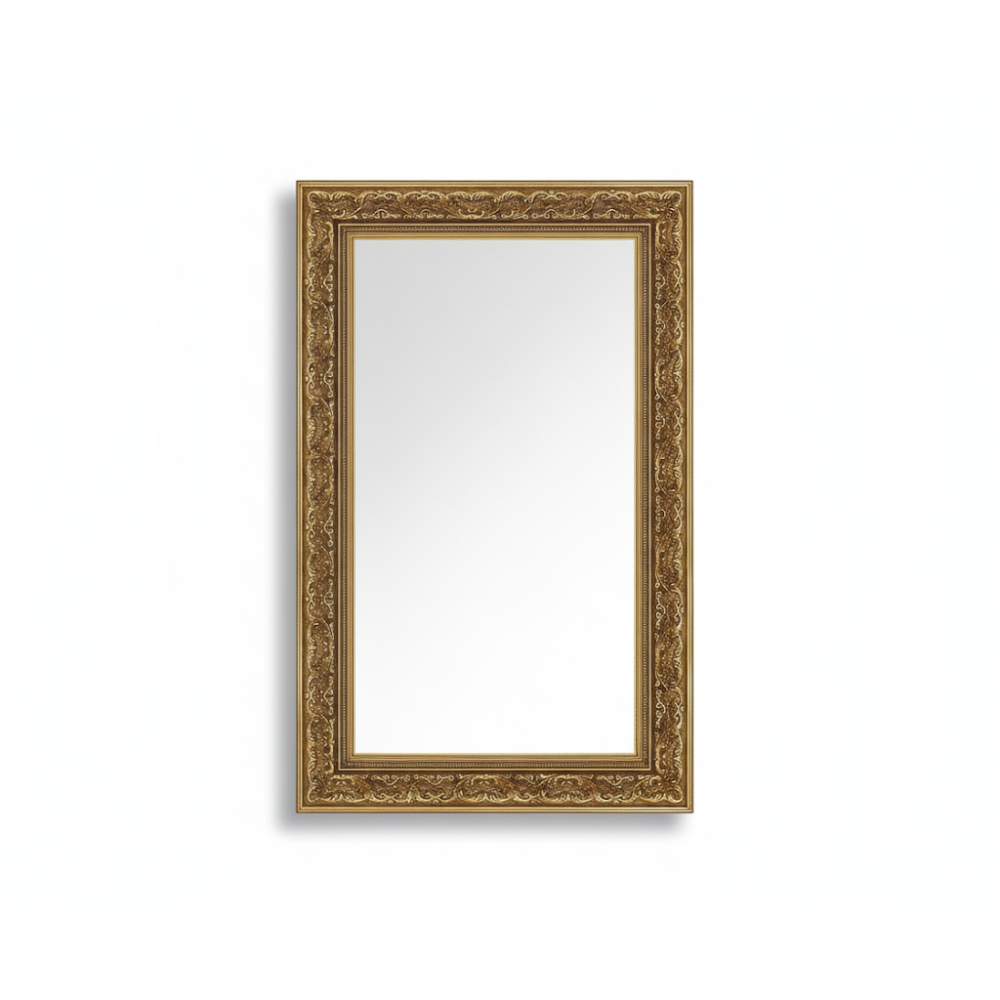 Зеркало Джули оформлено в изящной деревянной раме с декоративным золотым покрытием. Оно сочетает практичность и выразительный дизайн, превращаясь в центральный акцент интерьера. Тёплый золотой оттенок придаёт помещению атмосферу роскоши и утончённости.