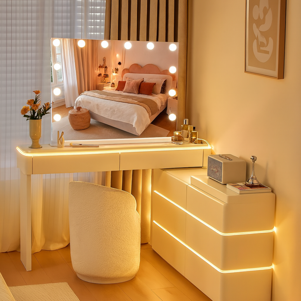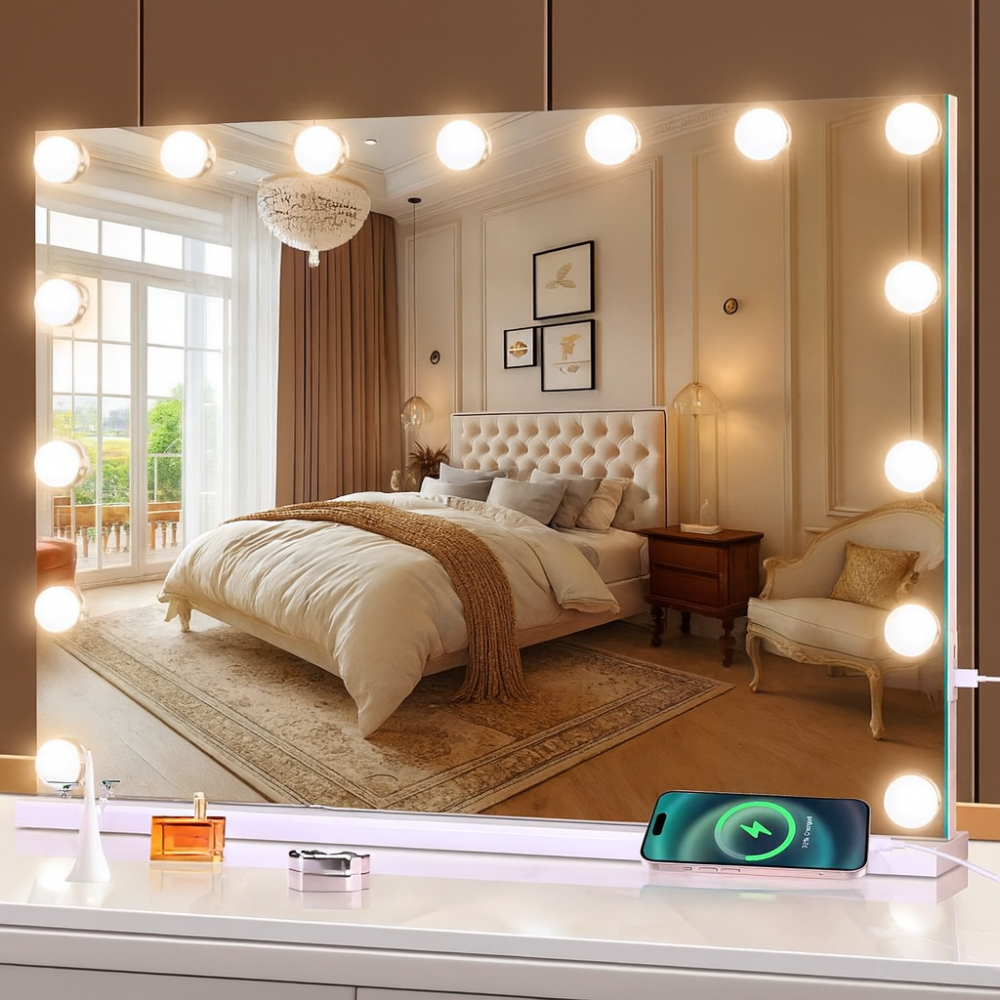 Классическая подсветка лампочками по периметру создаёт яркий и равномерный свет без теней, обеспечивая точную цветопередачу и комфортную работу с макияжем, укладкой, уходом за кожей и съёмкой контента. Такой тип освещения максимально приближен к студийному и помогает добиться безупречного результата.