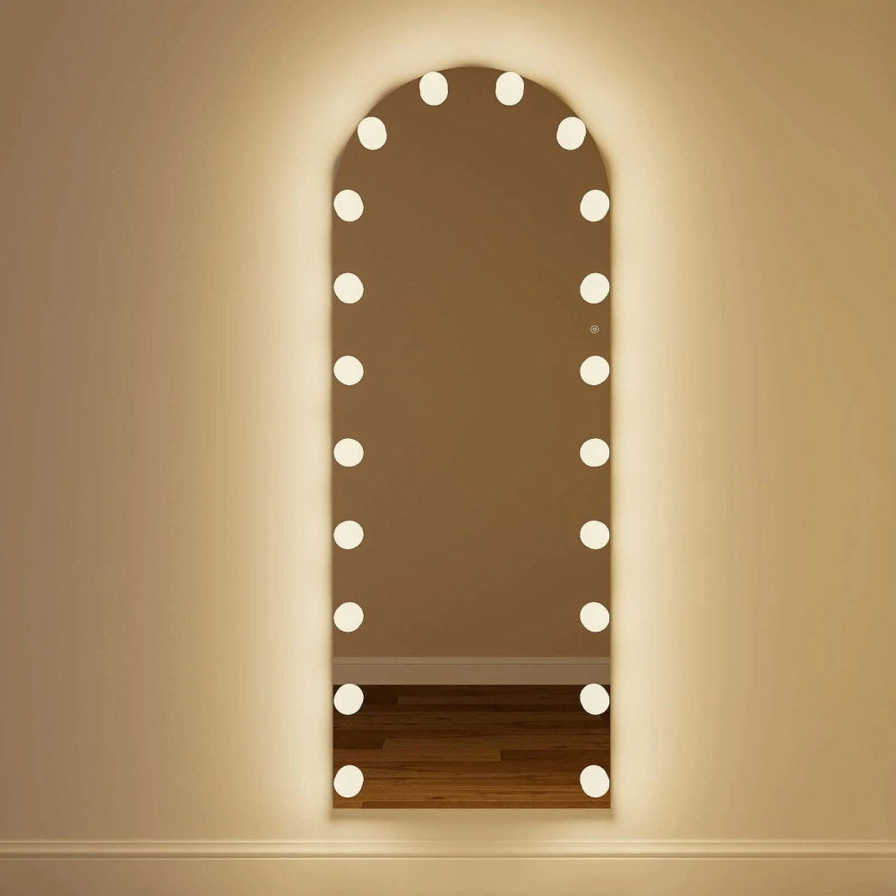 Настенное и напольное большое гримерное зеркало-арка с подсветкой лампочками «Элис»