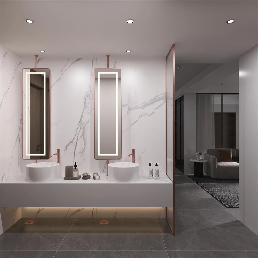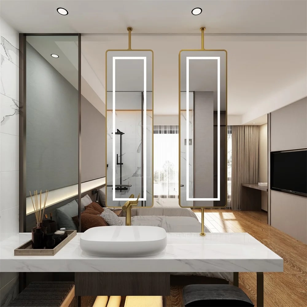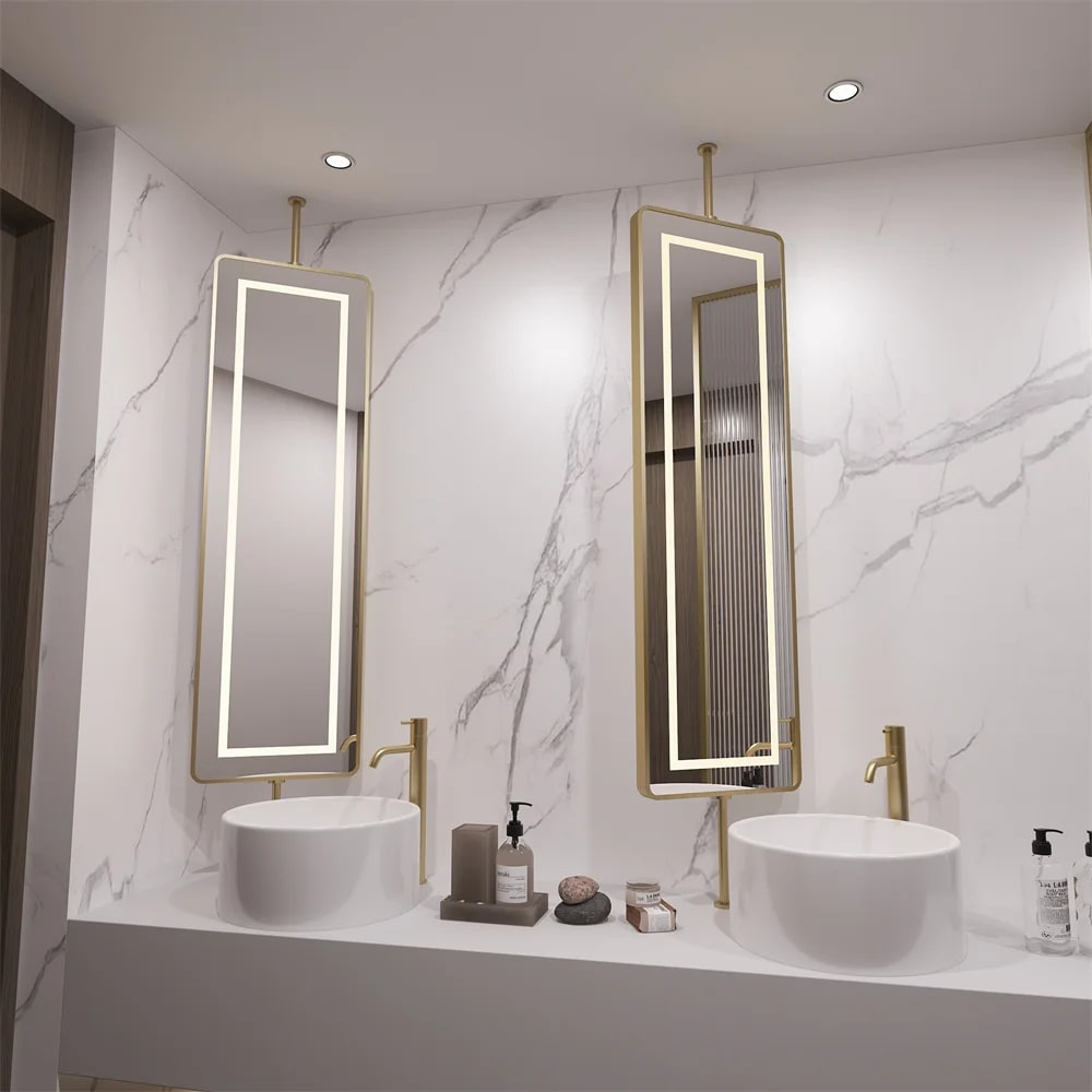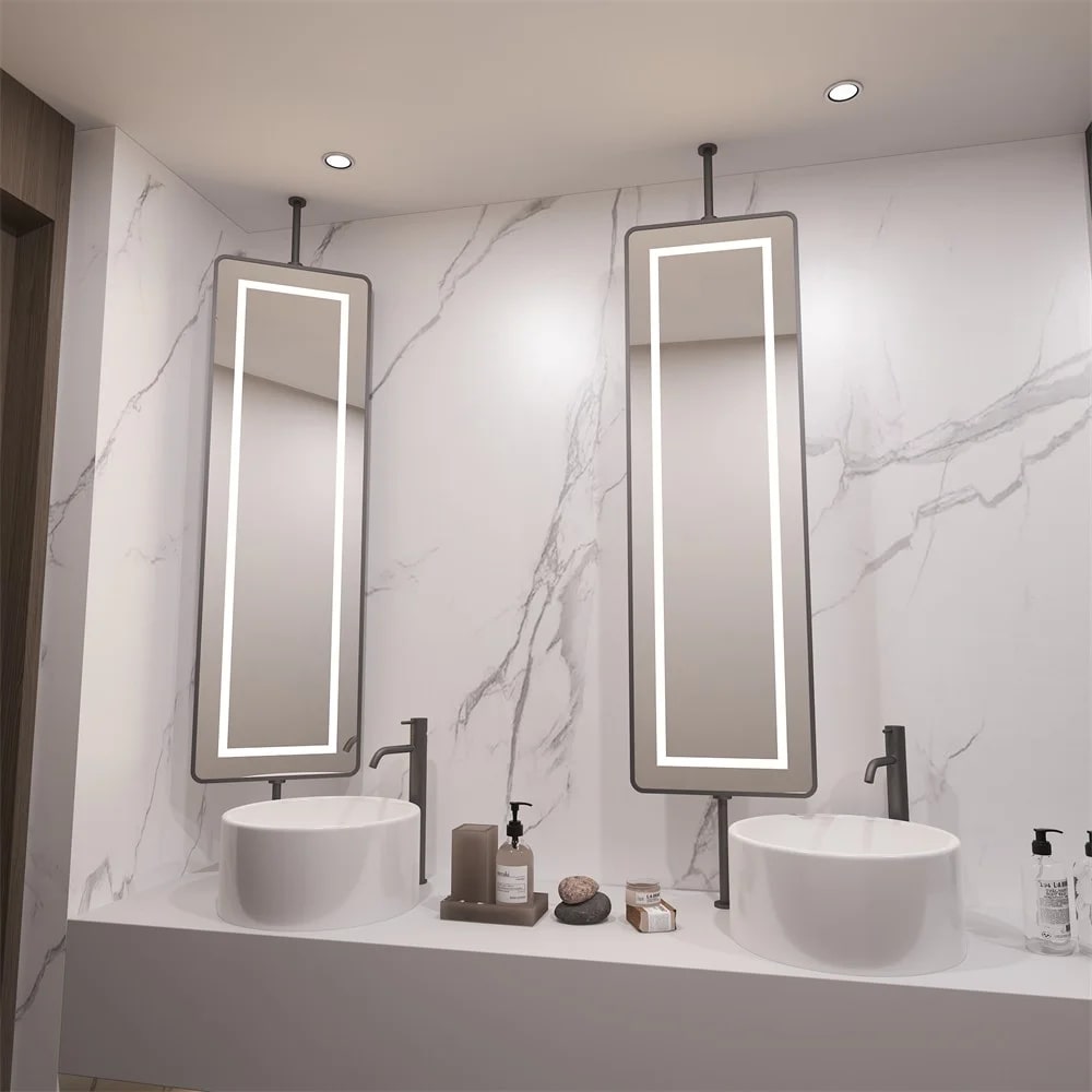 Современное прямоугольное зеркало с креплением на две штанги — стильное и функциональное решение для интерьеров с акцентом на геометрию и лёгкость. Крепление сверху и снизу придаёт конструкции устойчивость и создаёт эффект парящей поверхности, а фронтальная LED-подсветка обеспечивает равномерное освещение без бликов.