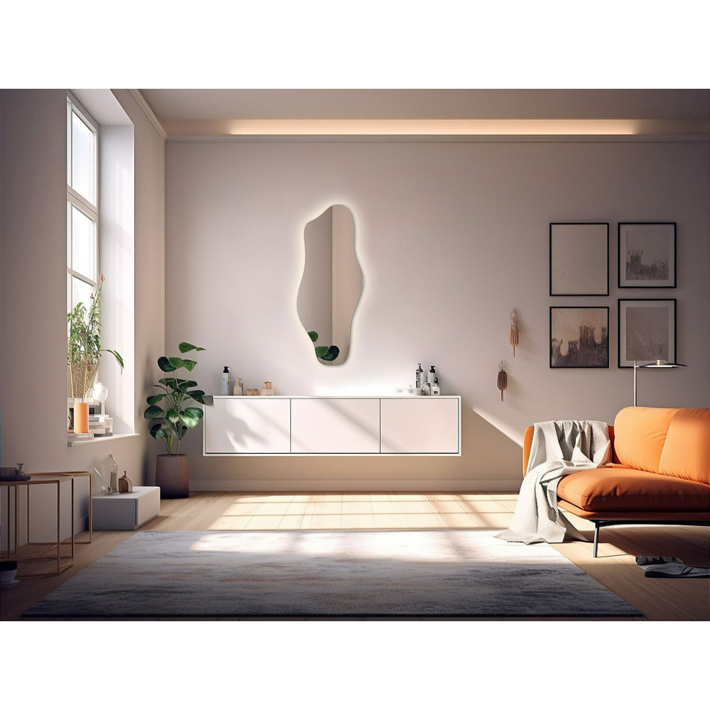 Современное дизайнерское зеркало нестандартной формы с мягкой парящей подсветкой станет ярким акцентом интерьера. Благодаря плавным линиям и отсутствию строгой геометрии оно добавляет пространству динамику и лёгкость, а светодиодная подсветка создаёт эффект объёмности и уюта.
