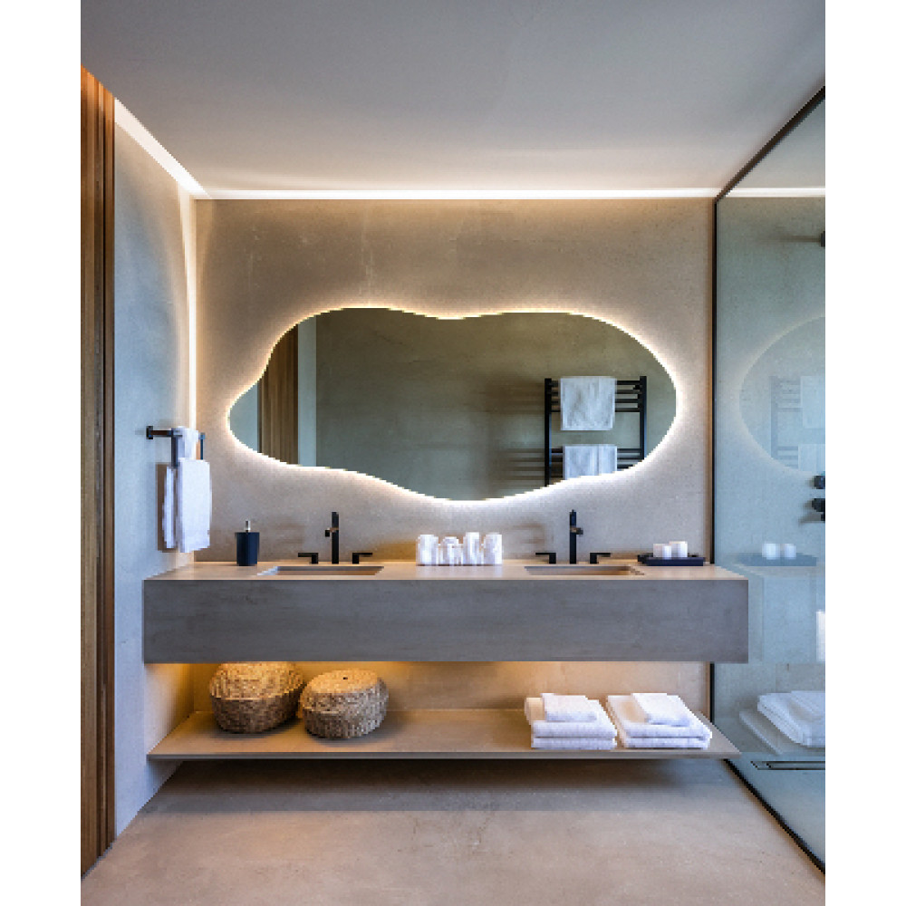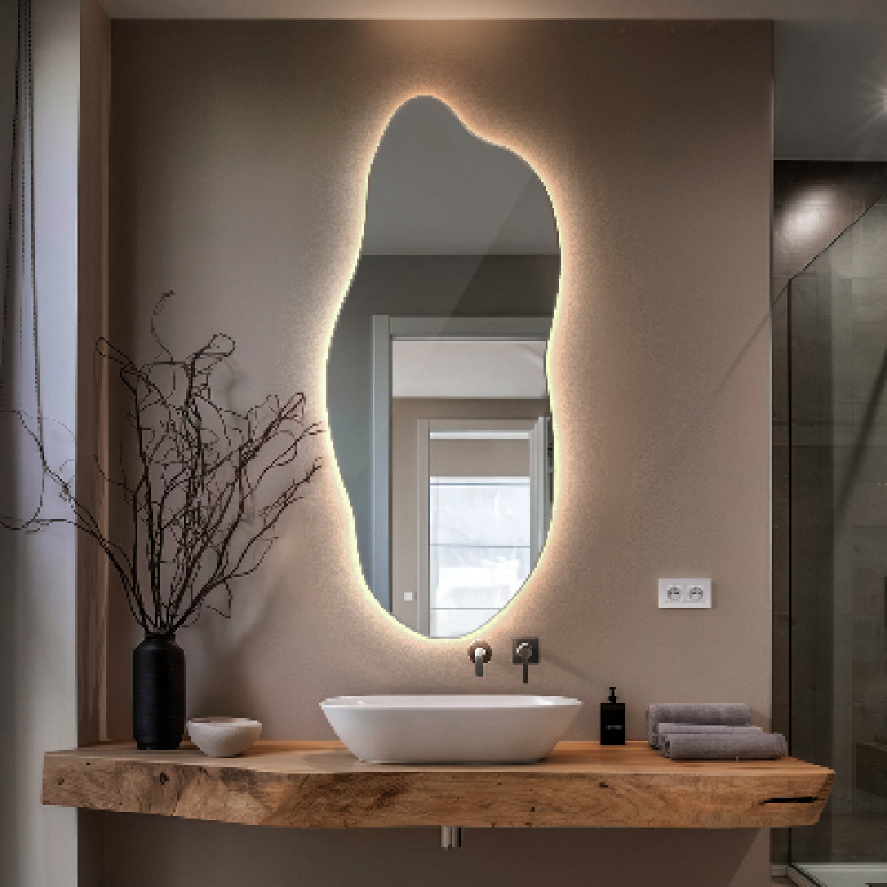 Зеркало ASM018 создано для тех, кто ценит нестандартные формы и атмосферный свет. Его бесформенный силуэт превращает зеркало в арт-объект, а мягкая задняя LED-подсветка подчёркивает контур и создаёт эффект парящего элемента, наполняя интерьер уютом и современным стилем.