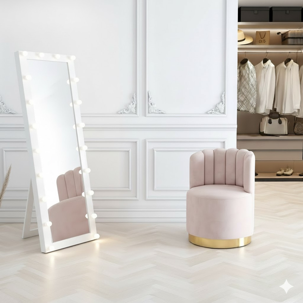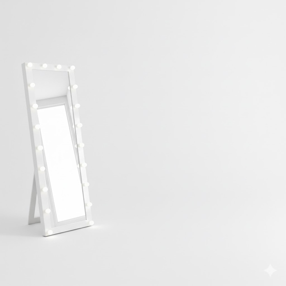 Классическая гримерная подсветка лампочками равномерно освещает лицо и фигуру, обеспечивая идеальные условия для макияжа, укладки, примерки одежды и работы с образами.