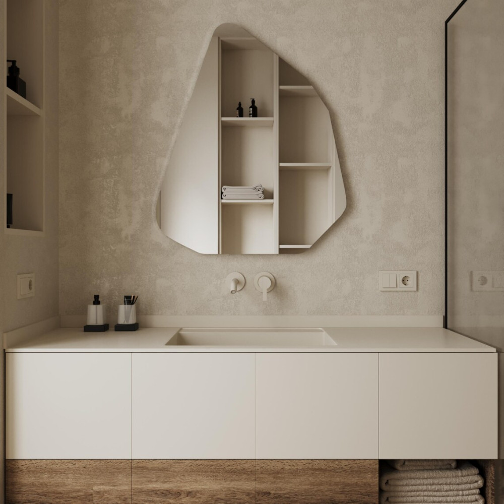 Преобразите интерьер с помощью уникального дизайнерского решения — настенного зеркала E0101. Его нестандартная форма и встроенная LED‑подсветка создают эффектный визуальный акцент, превращая функциональный предмет в арт‑объект.