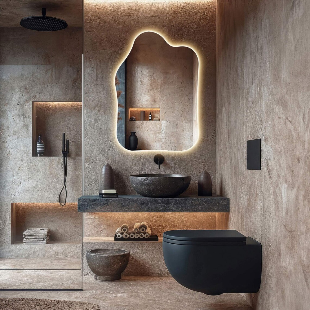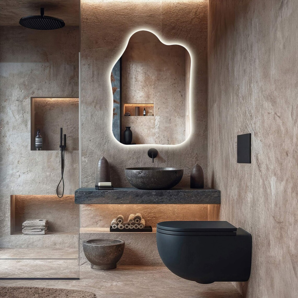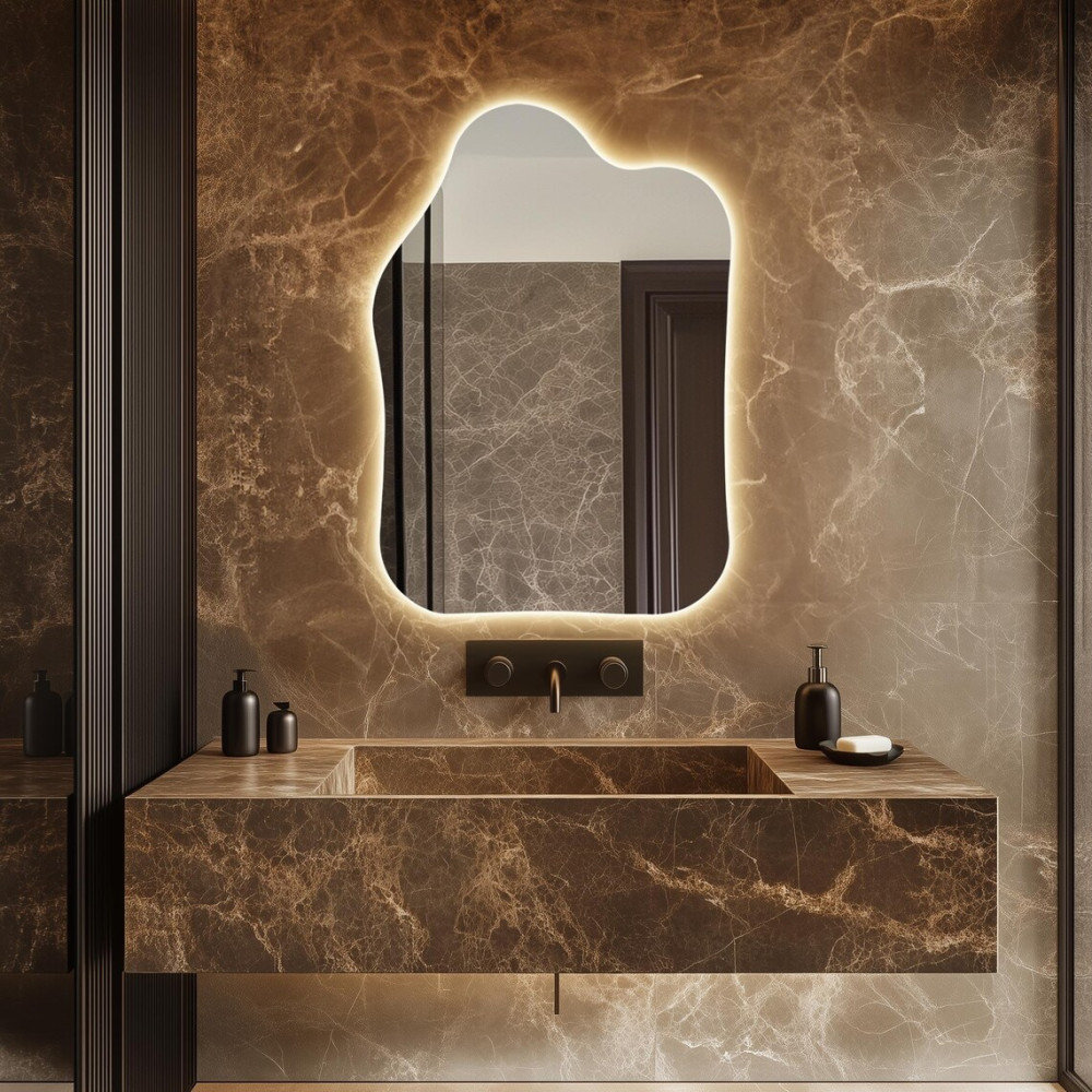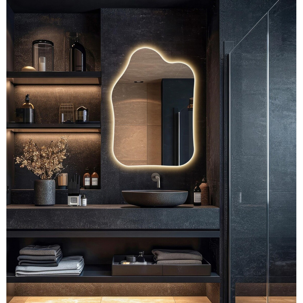 Зеркало E082 — это современный интерьерный акцент, который выделяется своей выразительной асимметричной формой и мягкой LED-подсветкой. Плавные линии и нестандартный силуэт создают эффект легкости и художественности, превращая зеркало в стильный декоративный элемент.