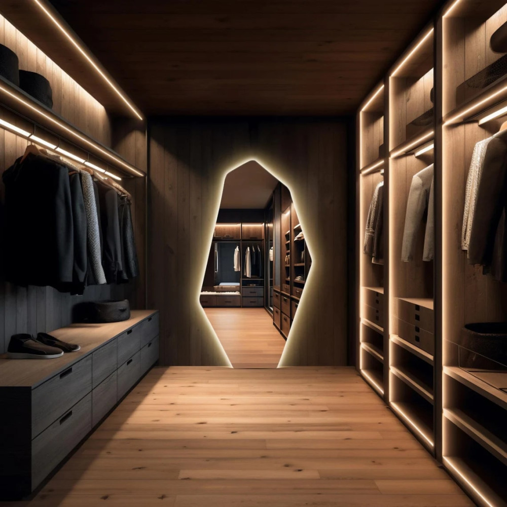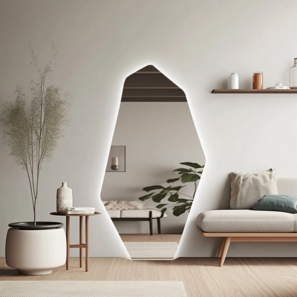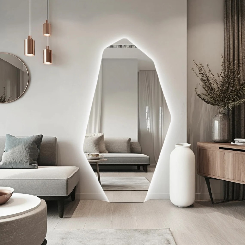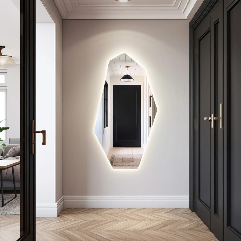 Зеркало E039 — современное и стильное решение для тех, кто ценит геометрию и свет в интерьере. Его уникальная семиугольная форма придаёт пространству выразительность и современный характер, а интерьерная подсветка по периметру создаёт мягкое равномерное свечение и эффект парения.