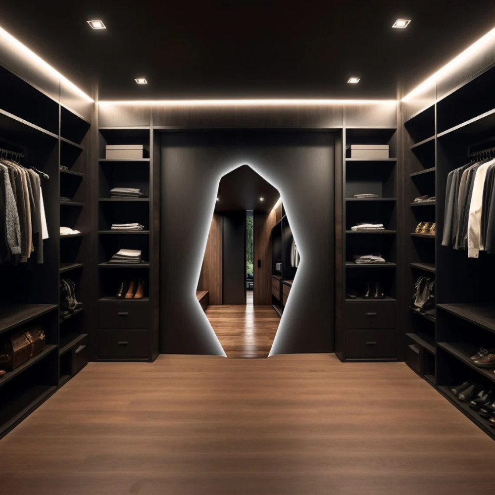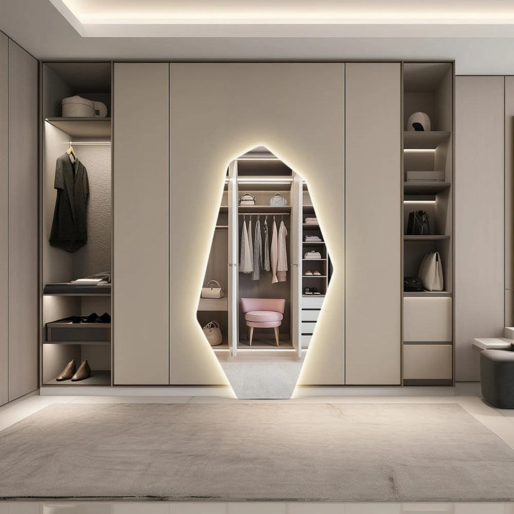 Модель универсальна — зеркало можно установить как настенным, так и напольным способом, что делает его идеальным выбором для спальни, гардеробной, гостиной, прихожей, бутика или салона красоты.