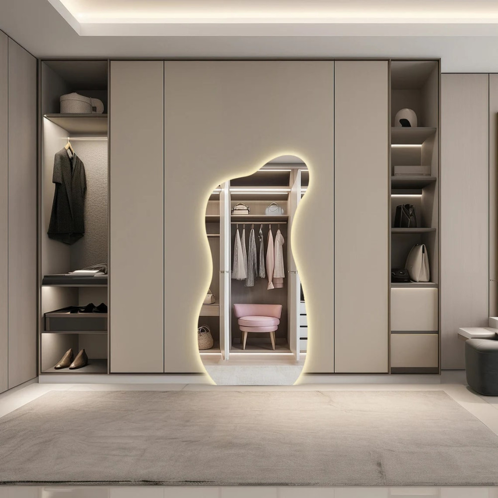 Зеркало E026 — стильное решение для современного интерьера, сочетающее выразительный дизайн и мягкое освещение. Его нестандартная форма добавляет пространству индивидуальность и динамику, а тыльная контурная подсветка создаёт эффект парения и наполняет комнату уютным рассеянным светом.