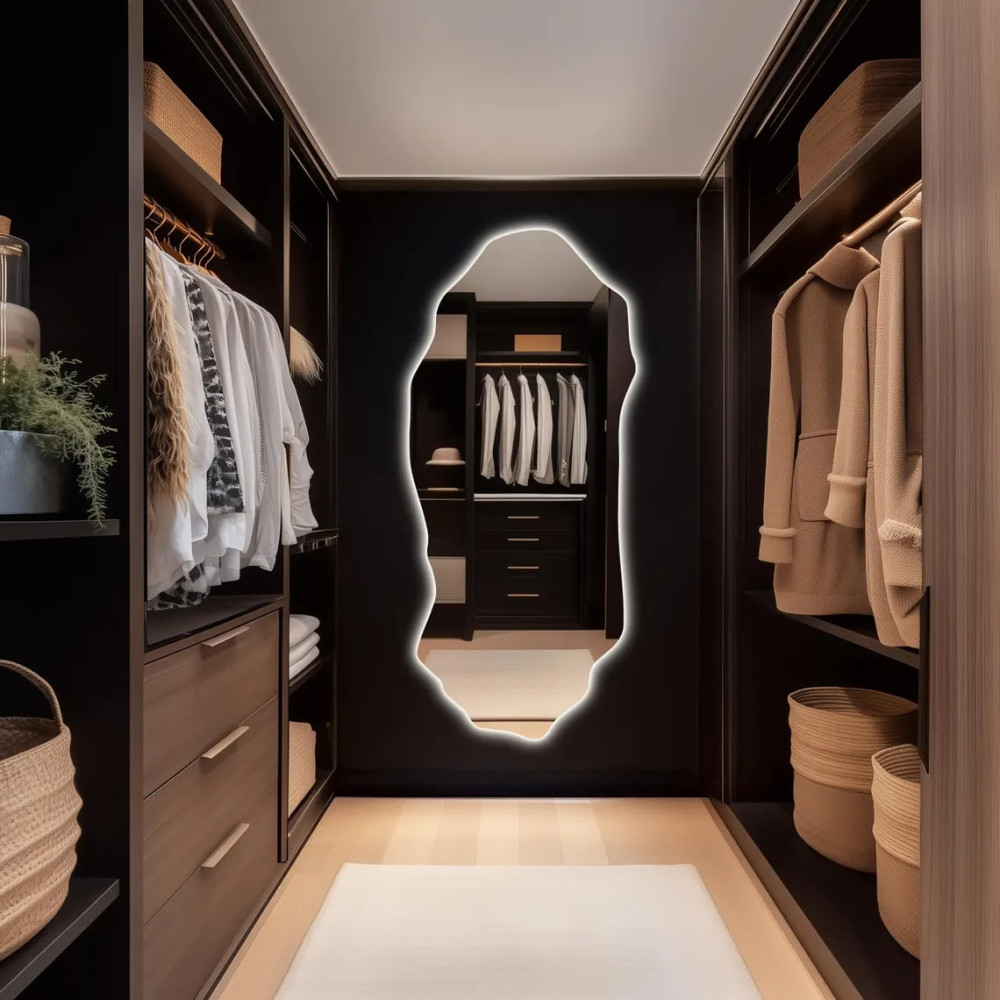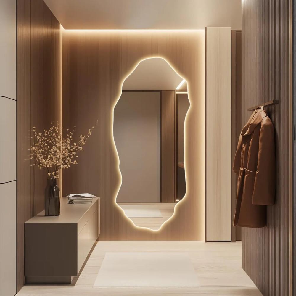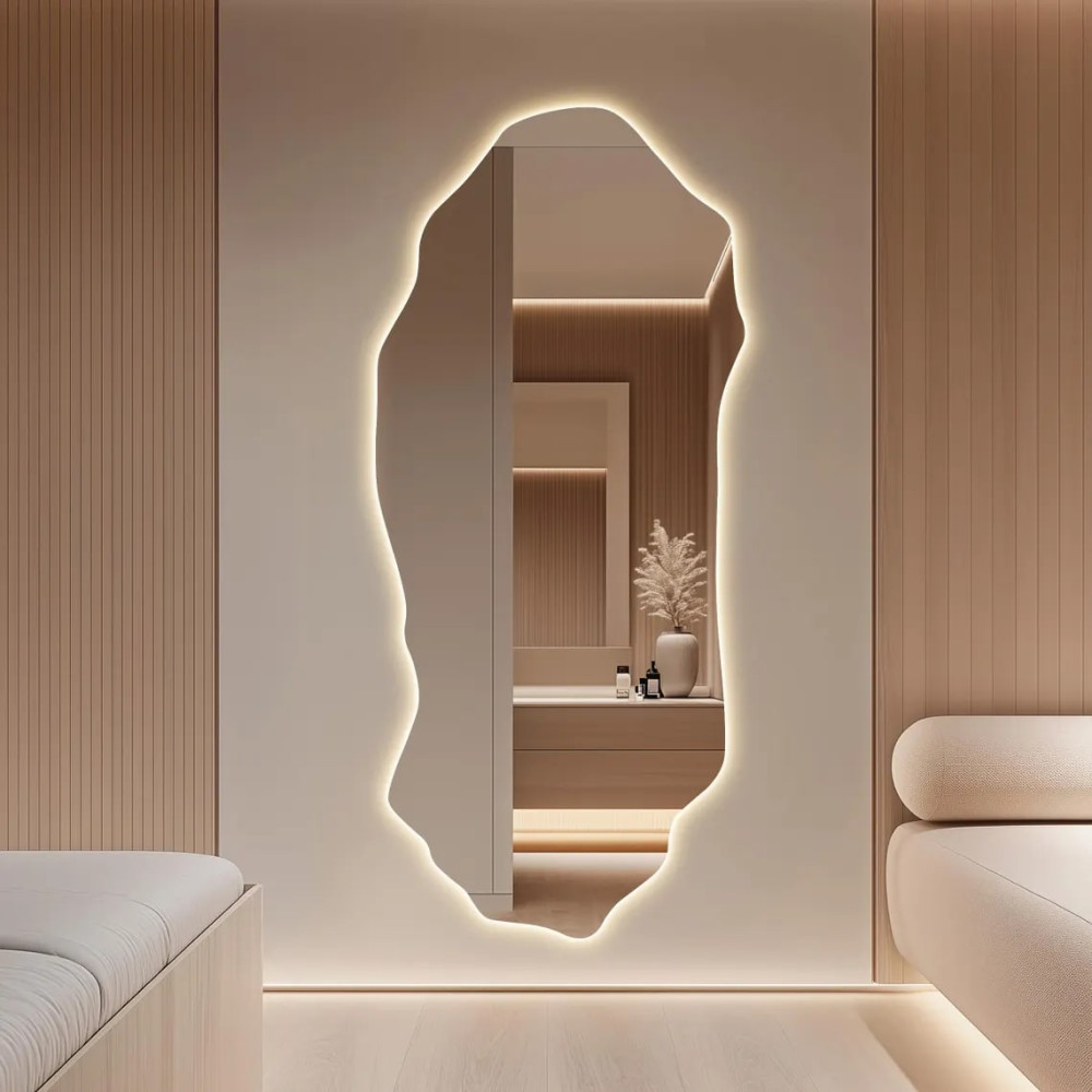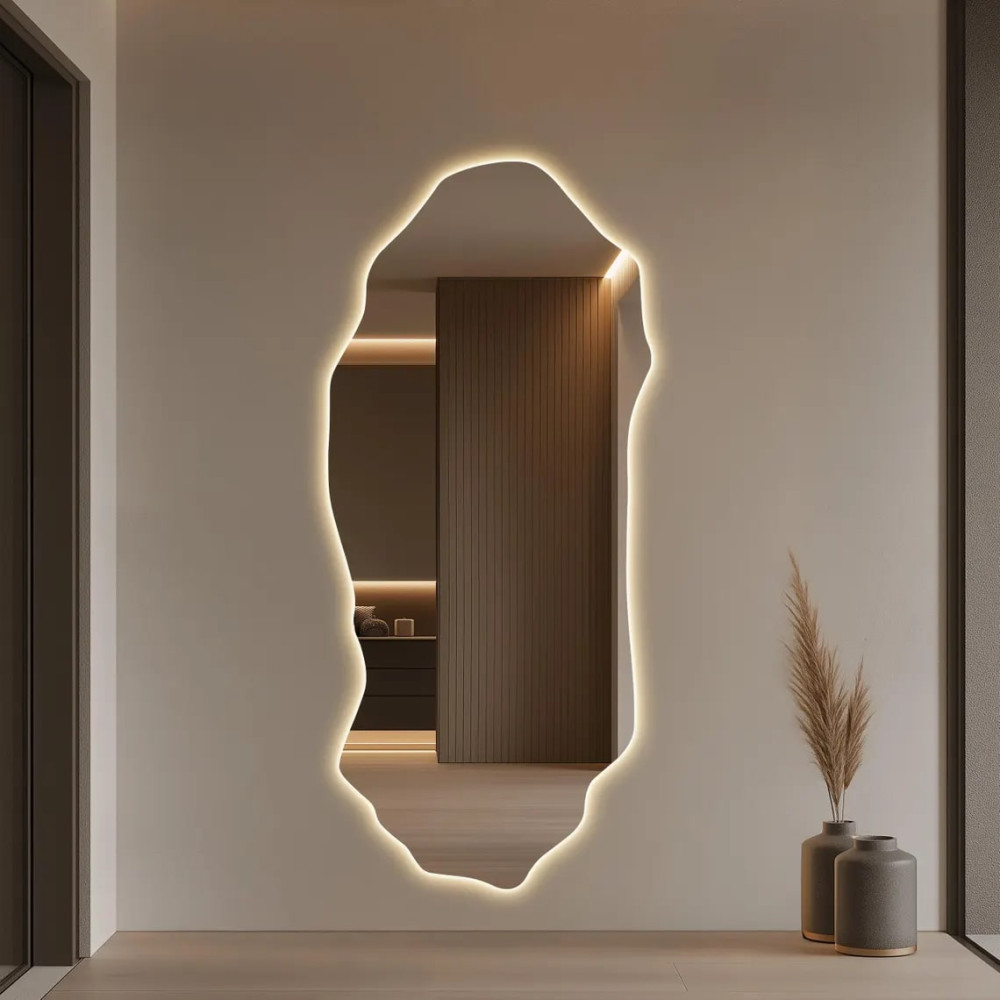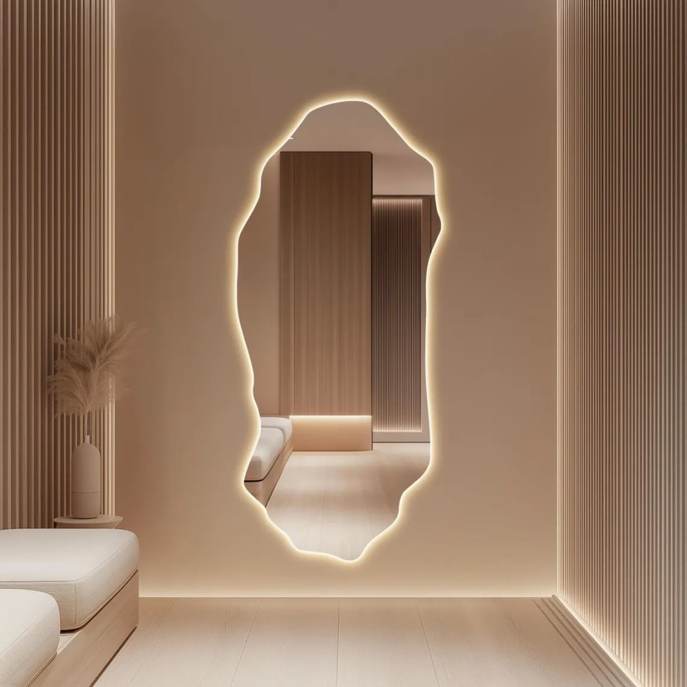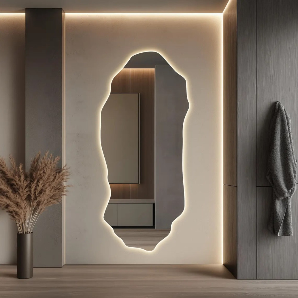 Большое настенное зеркало необычной формы в полный рост с интерьерной подсветкой E017