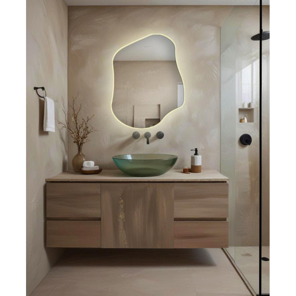 Зеркало E049 — стильный элемент современного интерьера, в котором оригинальная форма и световой дизайн объединяются в гармоничную композицию. Его асимметричная нестандартная форма привлекает внимание и делает пространство визуально динамичным, а задняя фоновая LED-подсветка создаёт эффект мягкого светового ореола и лёгкого парения на стене.