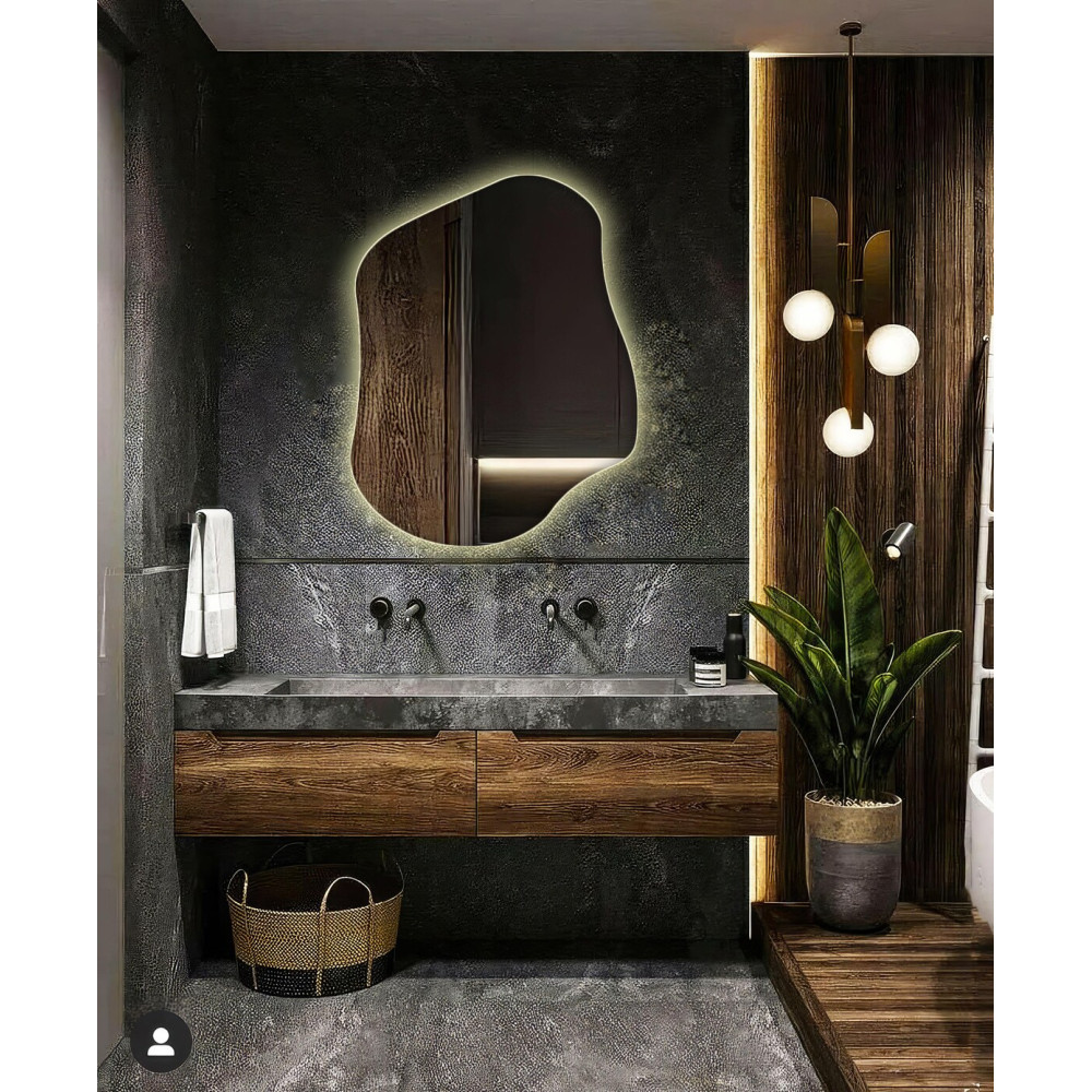 Настенное нестандартное зеркало асимметричной формы с задней фоновой подсветкой E049