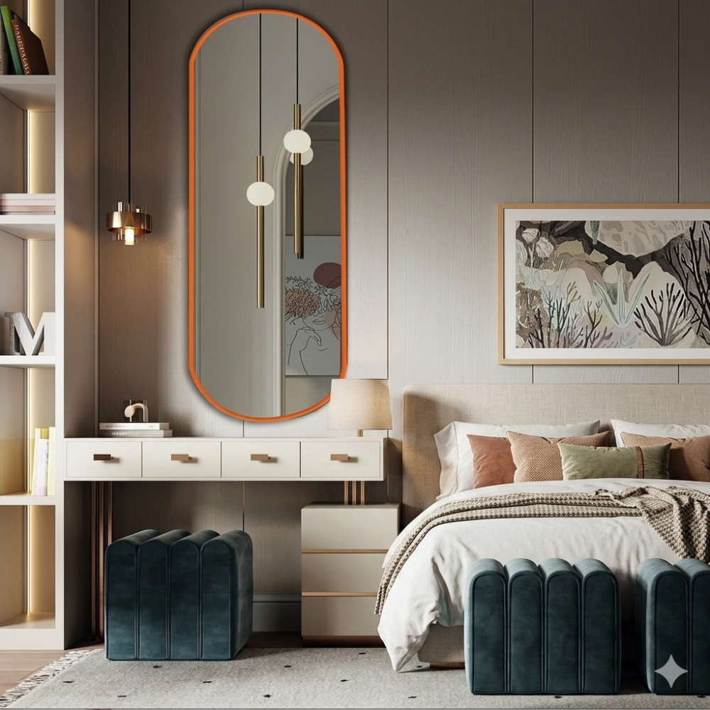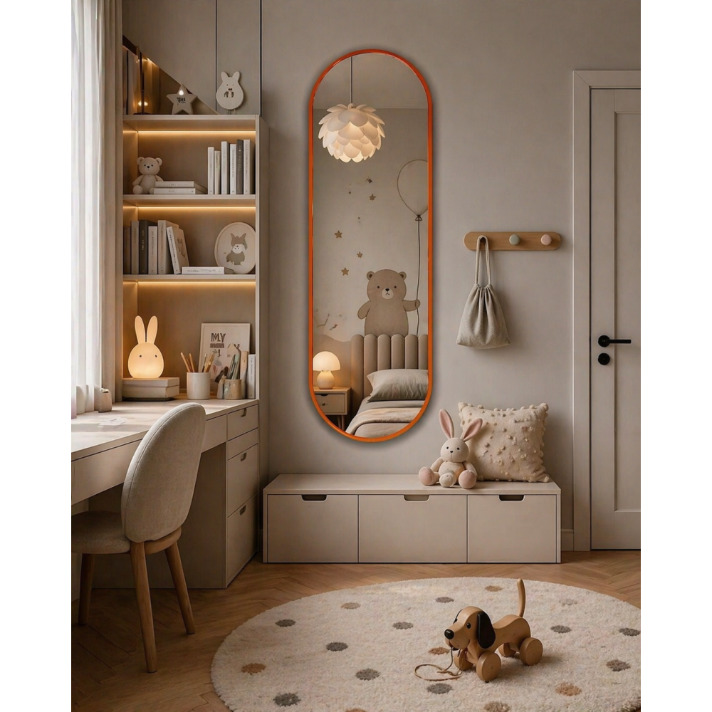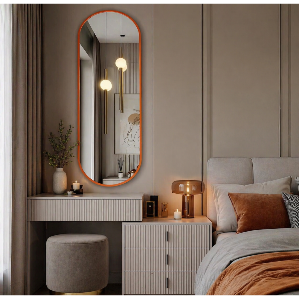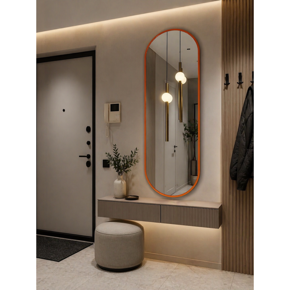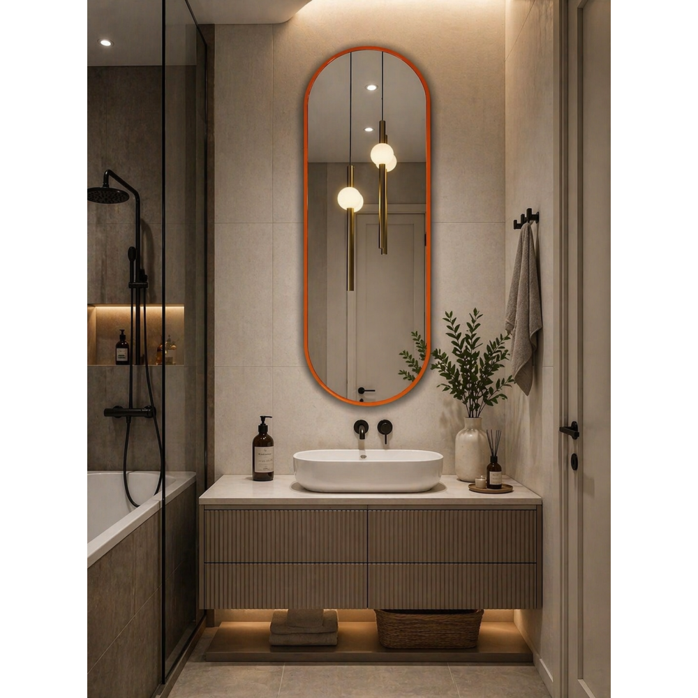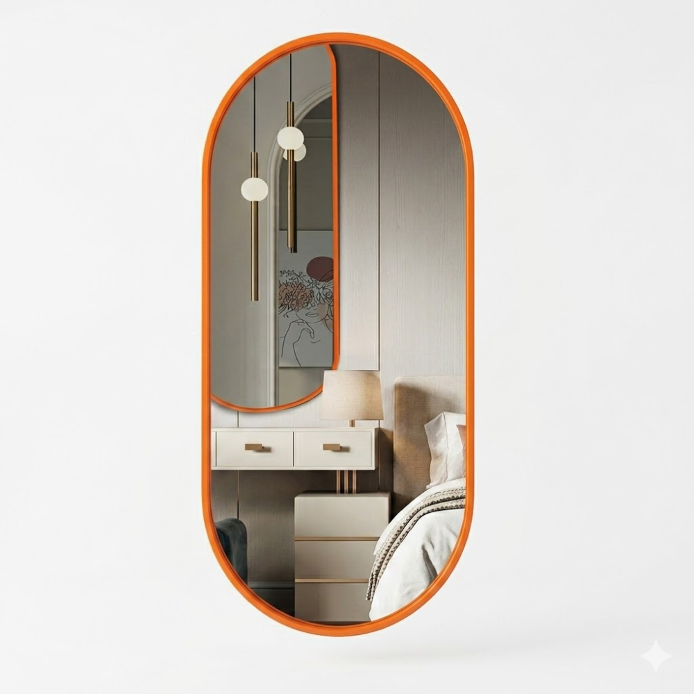 Модель N029 — это манифест современного стиля. Сочетание ультрамодной формы «капсула» (вытянутый овал) и сочного оранжевого цвета превращает функциональный предмет в главный интерьерный акцент. Это зеркало не просто отражает — оно задает ритм всему помещению.
