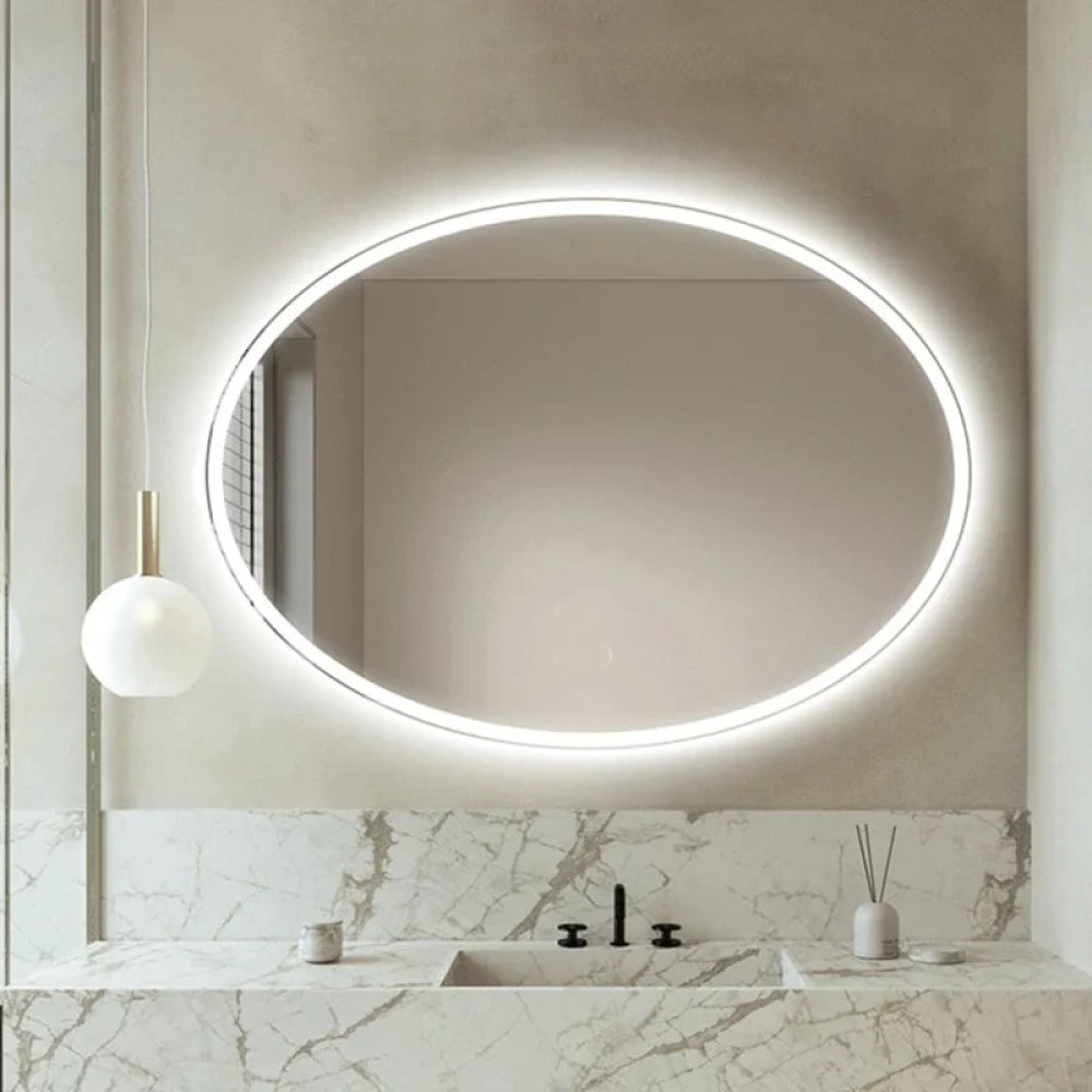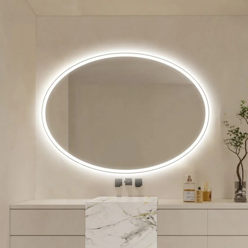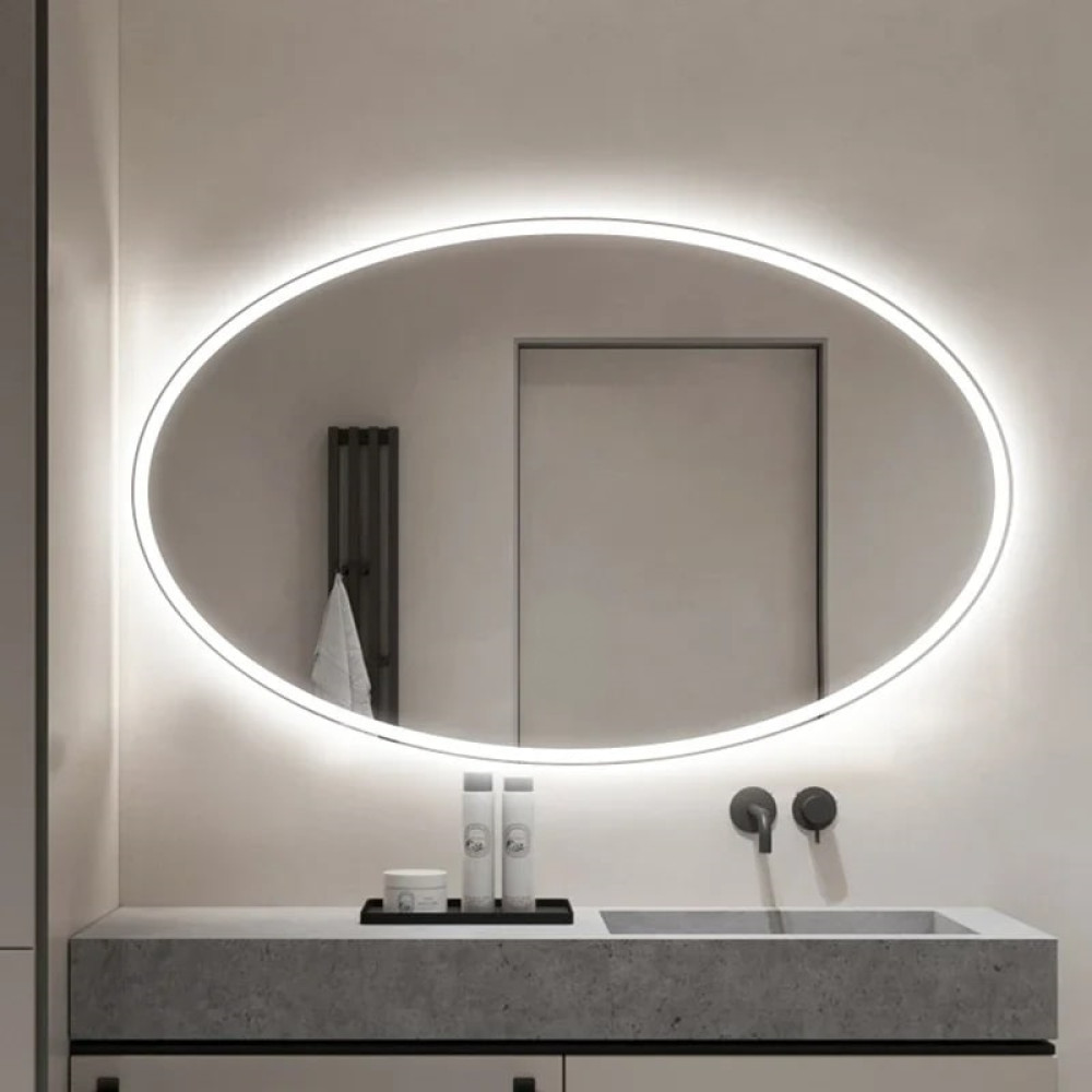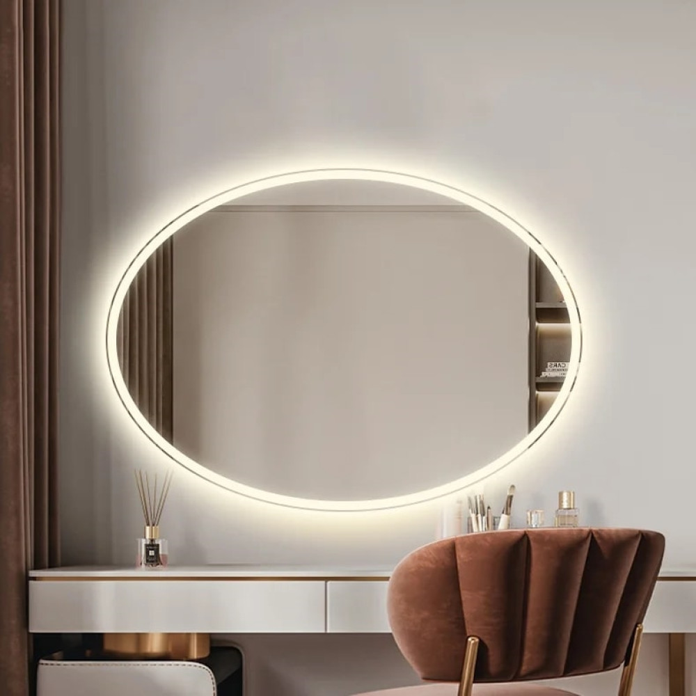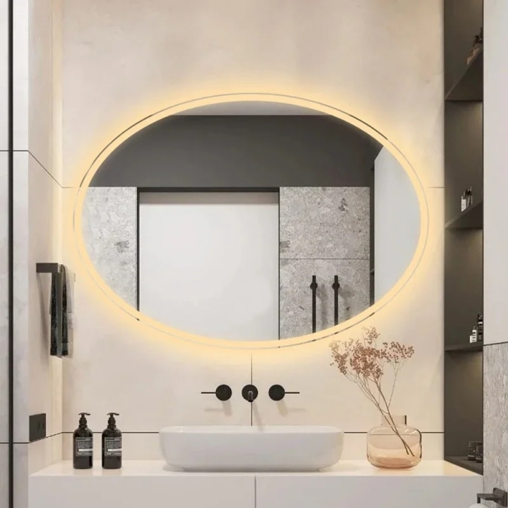 Современное зеркало в элегантной овальной форме с LED-подсветкой станет не только функциональным, но и стильным элементом интерьера. Благодаря мягкому, равномерному свету оно идеально подходит для макияжа, ухода за собой и комфортного освещения в любое время суток.