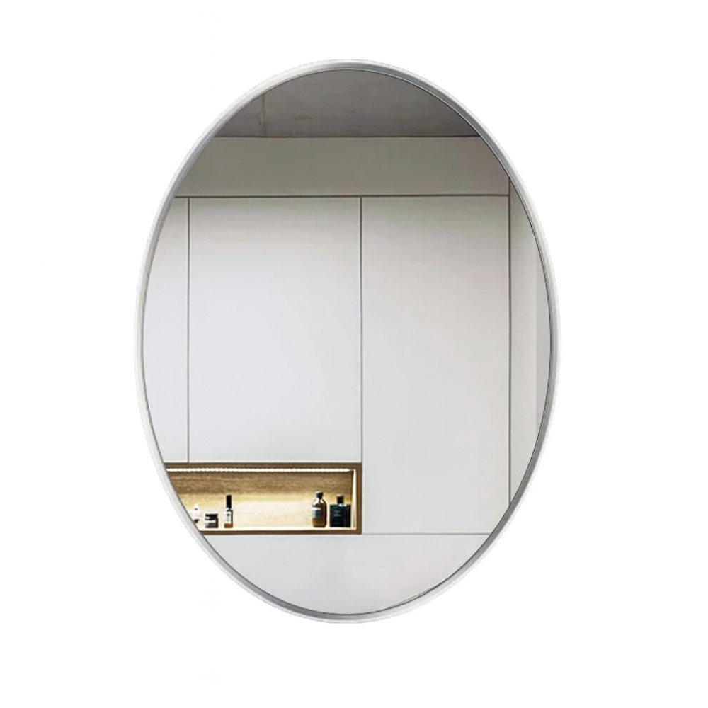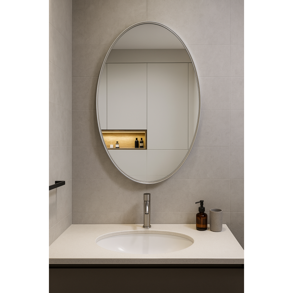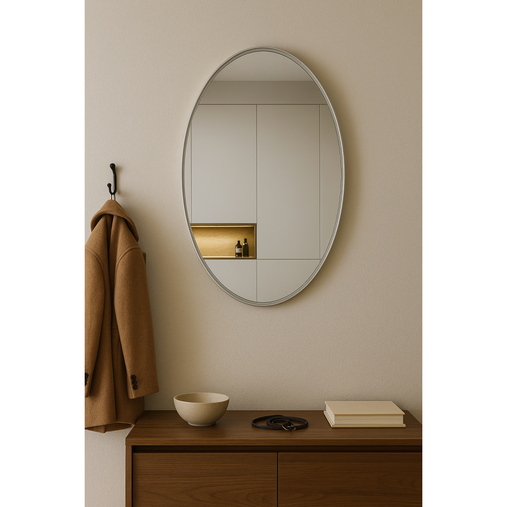 Овальное зеркало в серебряной раме из МДФ — универсальный элемент интерьера, который сочетает практичность и изысканный дизайн. Холодный серебристый оттенок придаёт зеркалу лёгкость и современный характер, а овальная форма делает его более мягким и гармоничным.