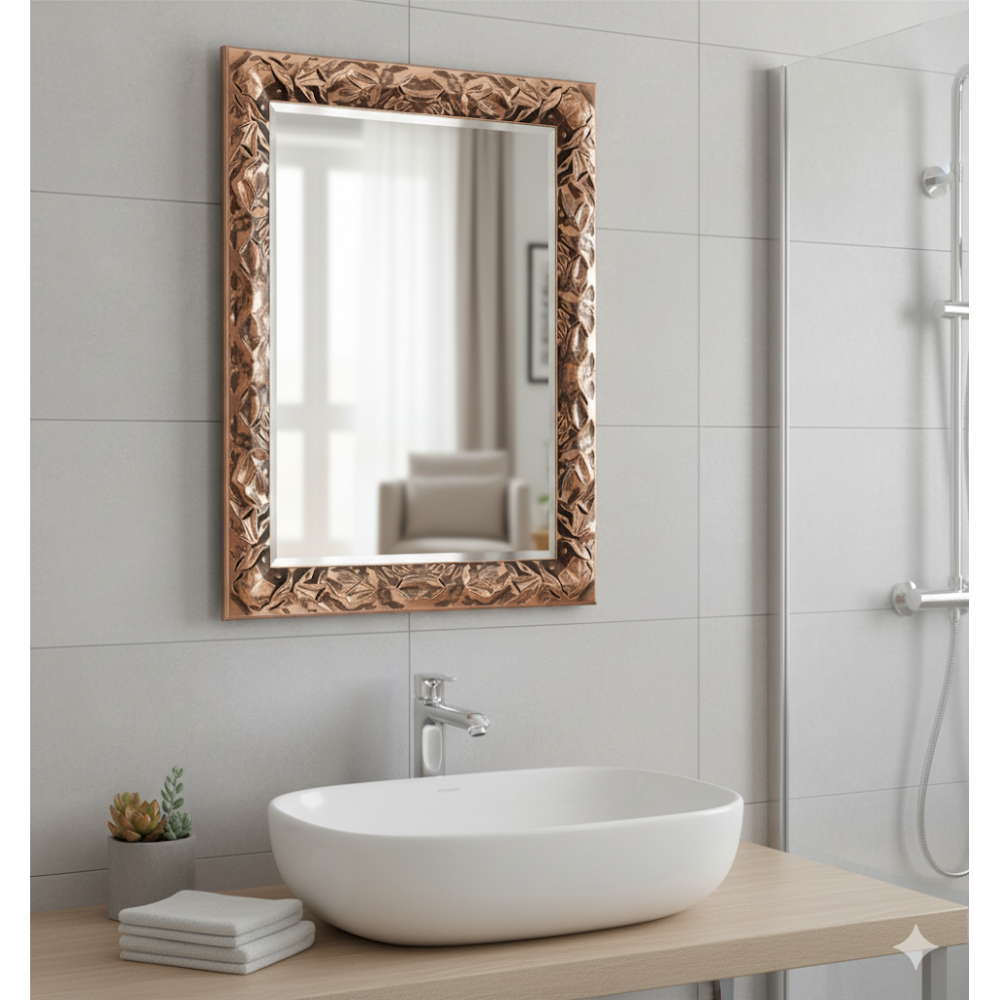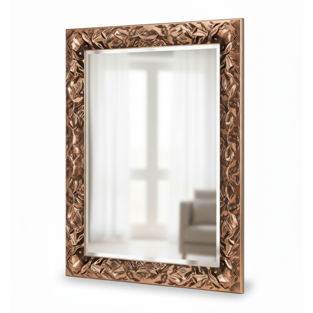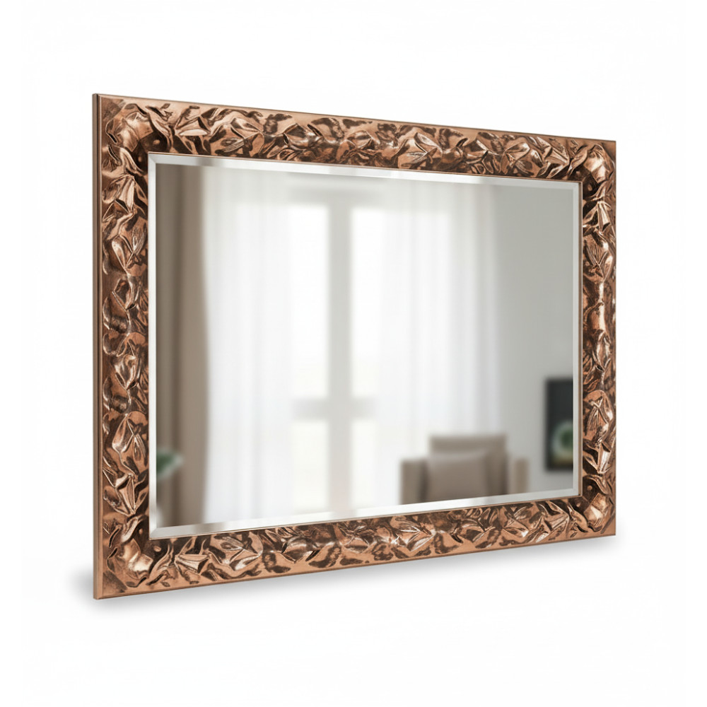 Зеркало Леония оформлено в декоративной пластиковой раме бронзового цвета. Тёплый металлический оттенок придаёт модели благородство и стиль, а фацетная обработка краёв создаёт игру света и утончённый блеск. Такая модель станет элегантным акцентом и подчеркнёт эстетику интерьера.