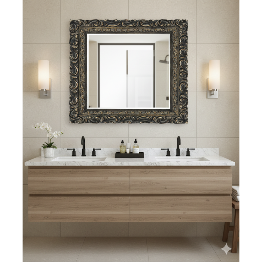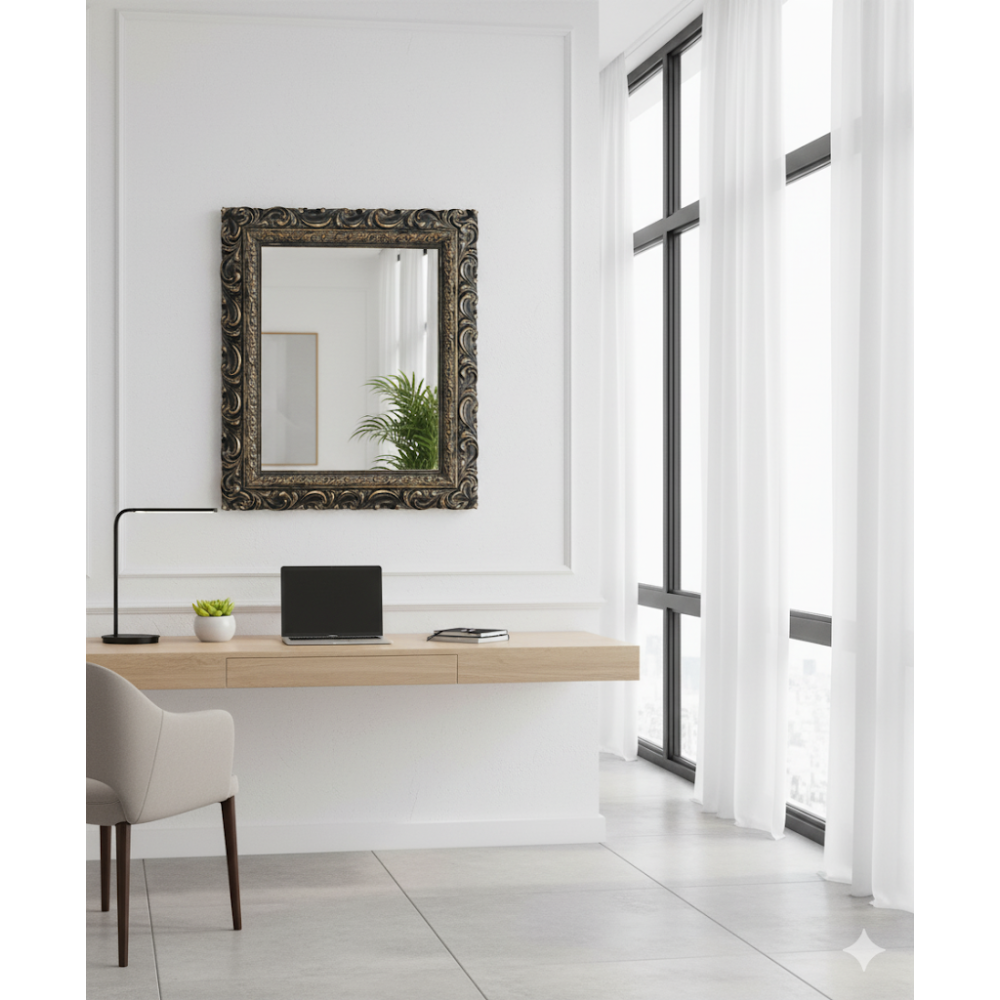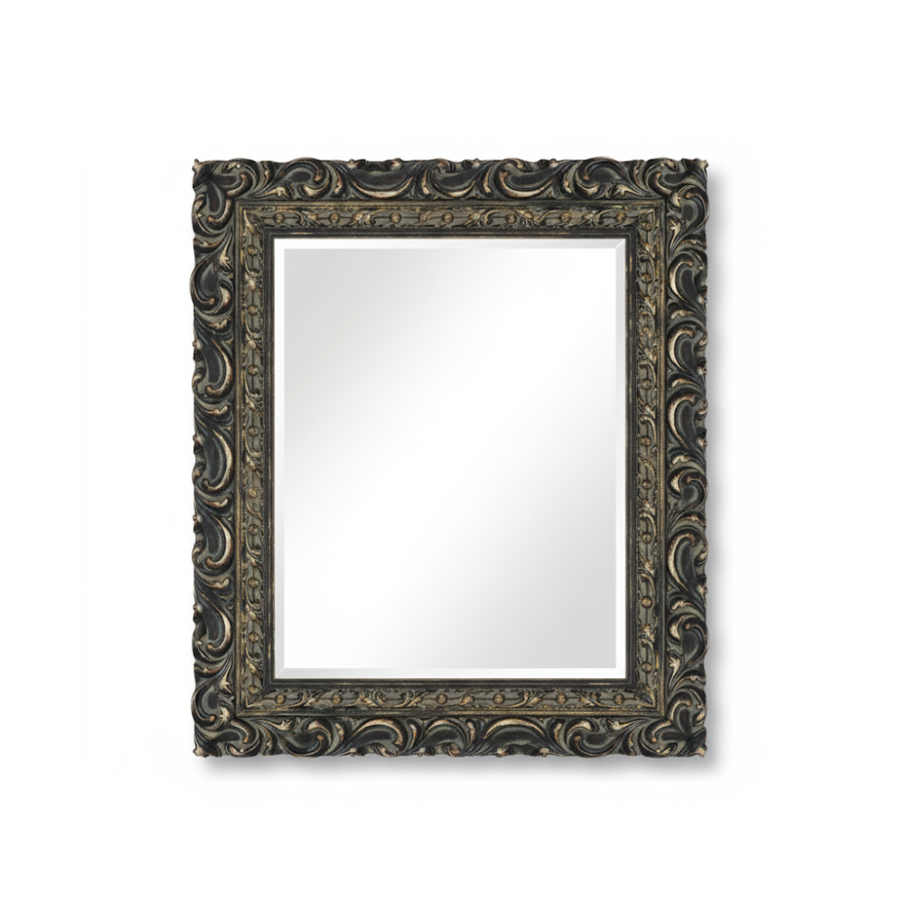 Зеркало Пацифик 001 выполнено в изящной деревянной декоративной раме глубокого чёрного цвета. Фацетная обработка по краям зеркала создаёт игру света и визуальный объём, превращая его в выразительный элемент интерьера. Такая модель подойдёт для интерьеров в стиле классика, современный минимализм или лофт.