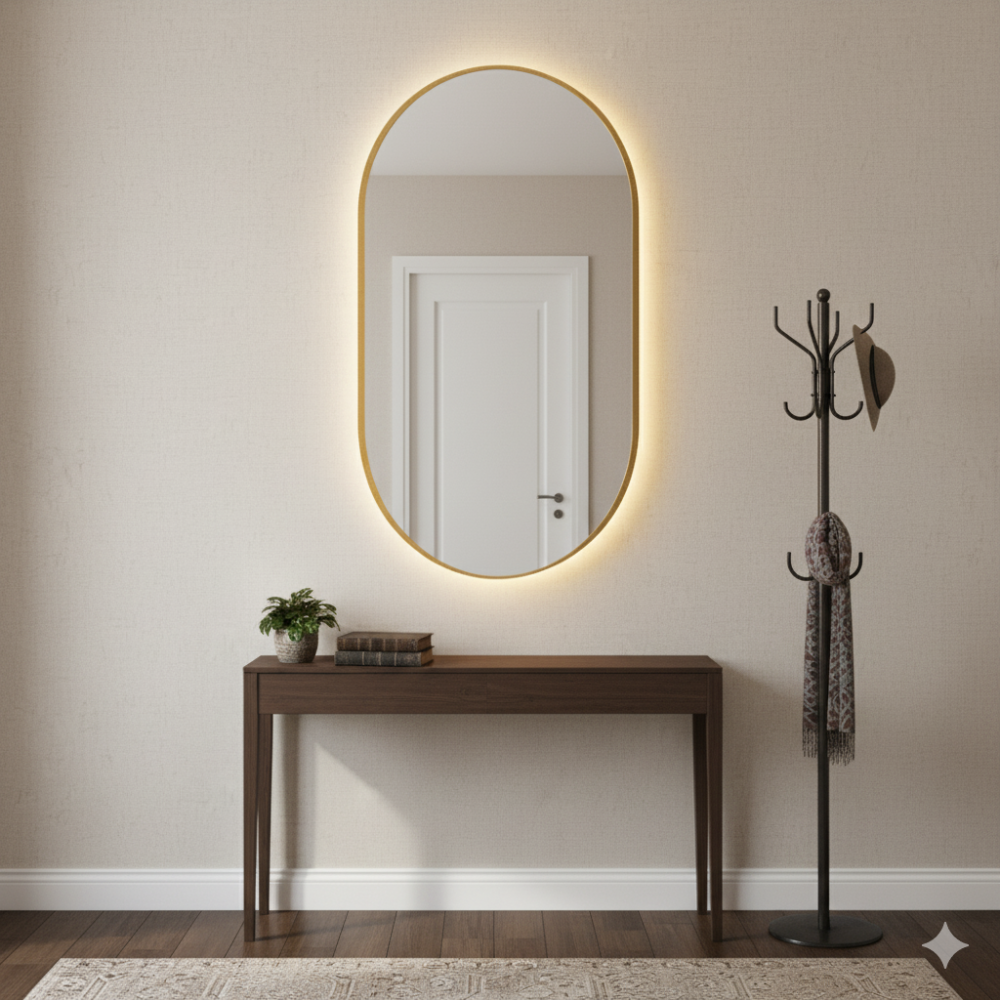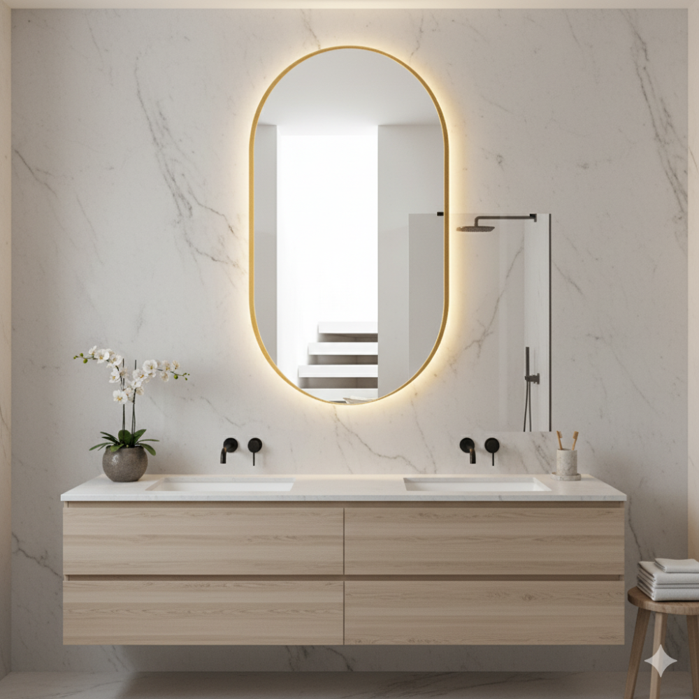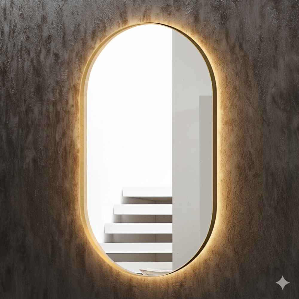 Зеркало Джанет 2 выполнено в модной капсульной овальной форме и обрамлено стильной латунной рамой. Встроенная LED-подсветка обеспечивает комфортное освещение без бликов и теней, что делает зеркало удобным для макияжа, бритья и повседневного ухода. Лаконичный дизайн и благородный металл создают гармоничный акцент в интерьере.