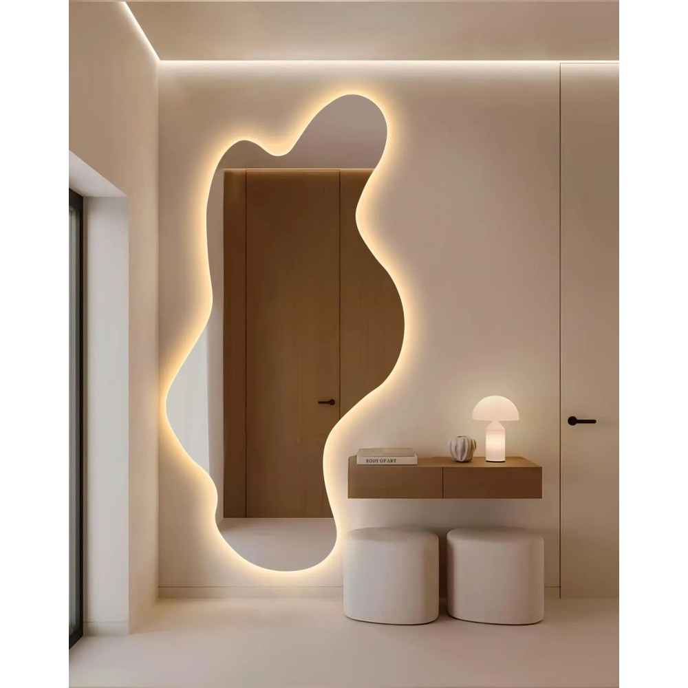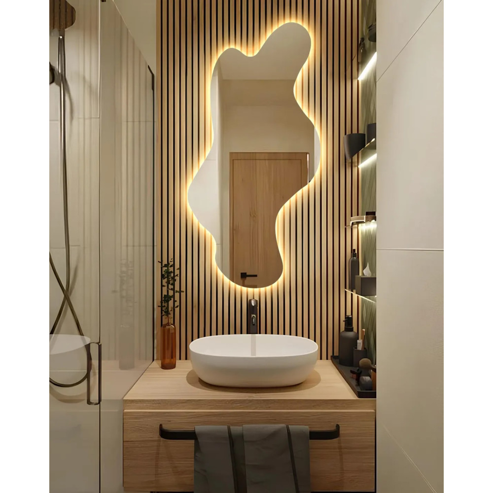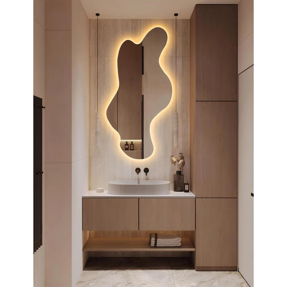 Задняя фоновая LED-подсветка создаёт мягкое сияние позади зеркала, подчёркивая его уникальный контур и формируя эффект «парящего» света. Такой декоративный приём добавляет интерьеру глубину, атмосферность и современную эстетику.