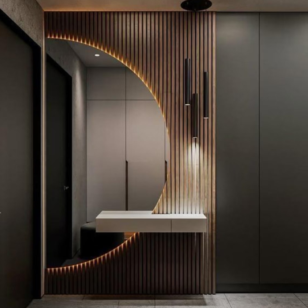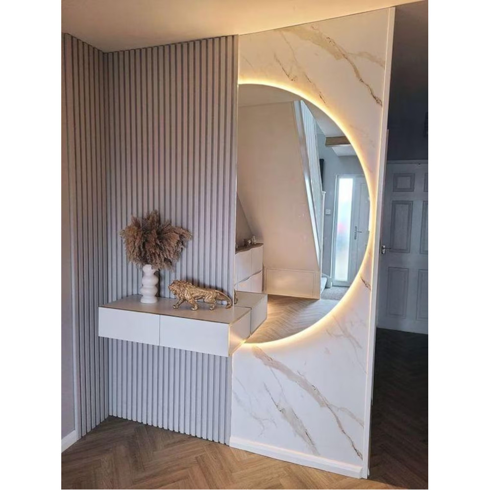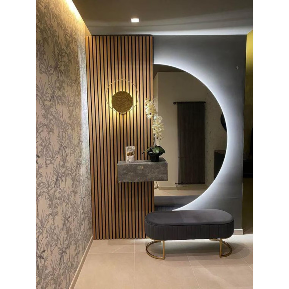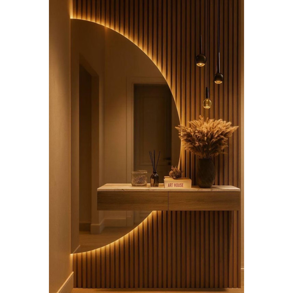 Мягкая фоновая LED-подсветка, скрытая за зеркальным полотном, создаёт атмосферное свечение, подчёркивает форму изделия и добавляет интерьеру глубины. Зеркало изготовлено из влагостойких материалов, что делает его подходящим как для жилых, так и для коммерческих помещений, включая ванные комнаты.