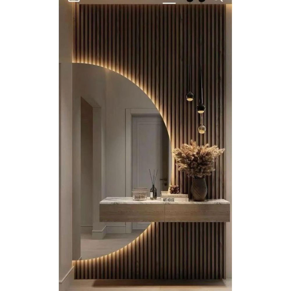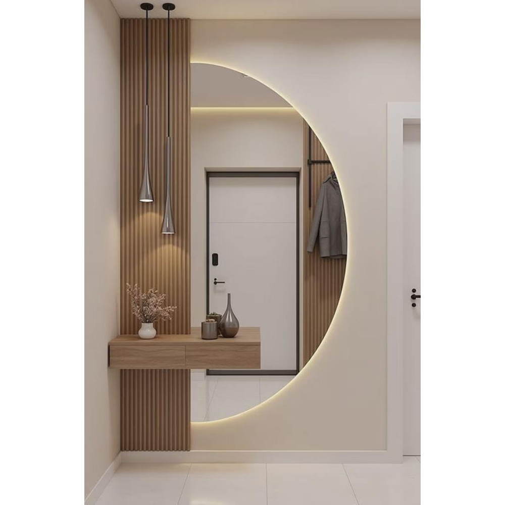 Полукруглое зеркало с задней фоновой подсветкой и вырезом для тумбы, консоли или шкафа — функциональный и стильный элемент интерьера, созданный для удобства и гармонии пространства. Благодаря вырезу в нижней части зеркало идеально интегрируется с мебелью, сохраняя целостность композиции и экономя место.