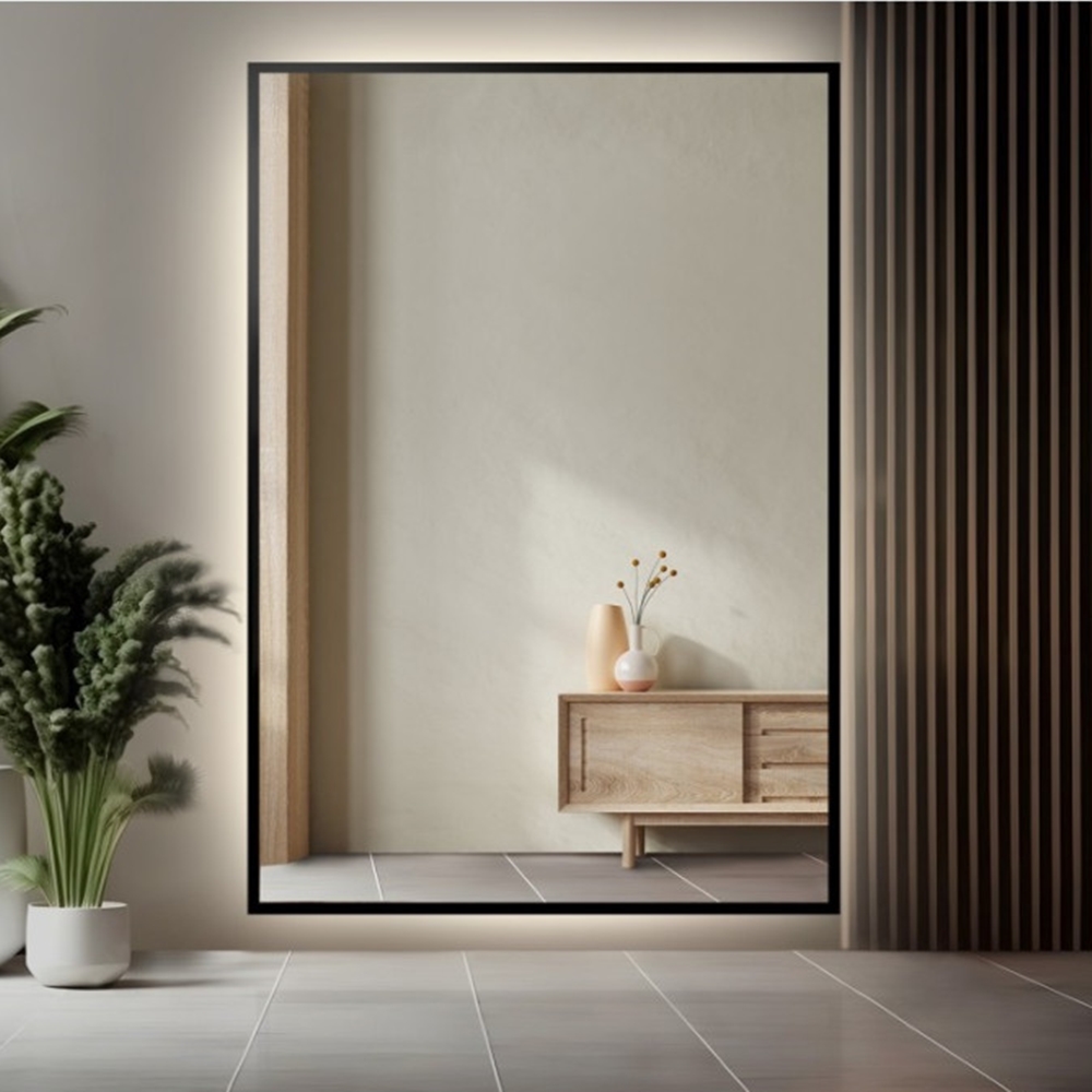 Прямоугольное большое зеркало с задней подсветкой в полный рост в чёрной раме F090