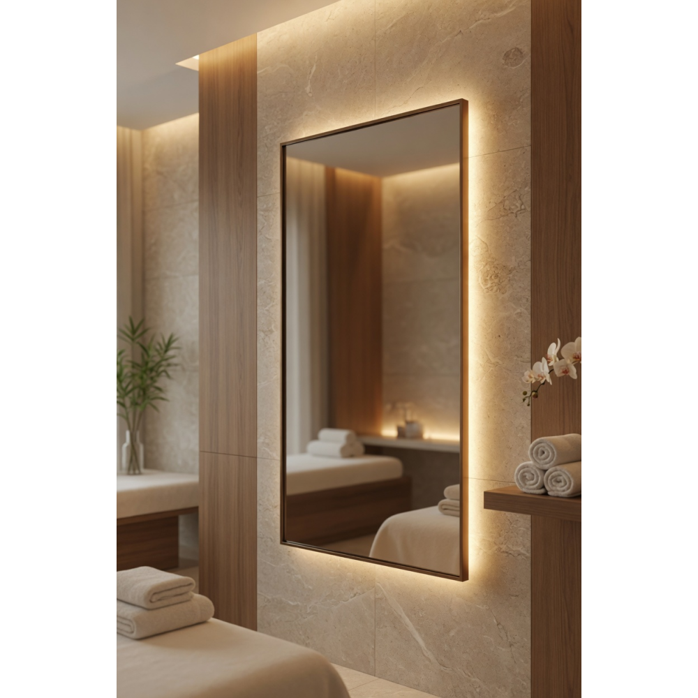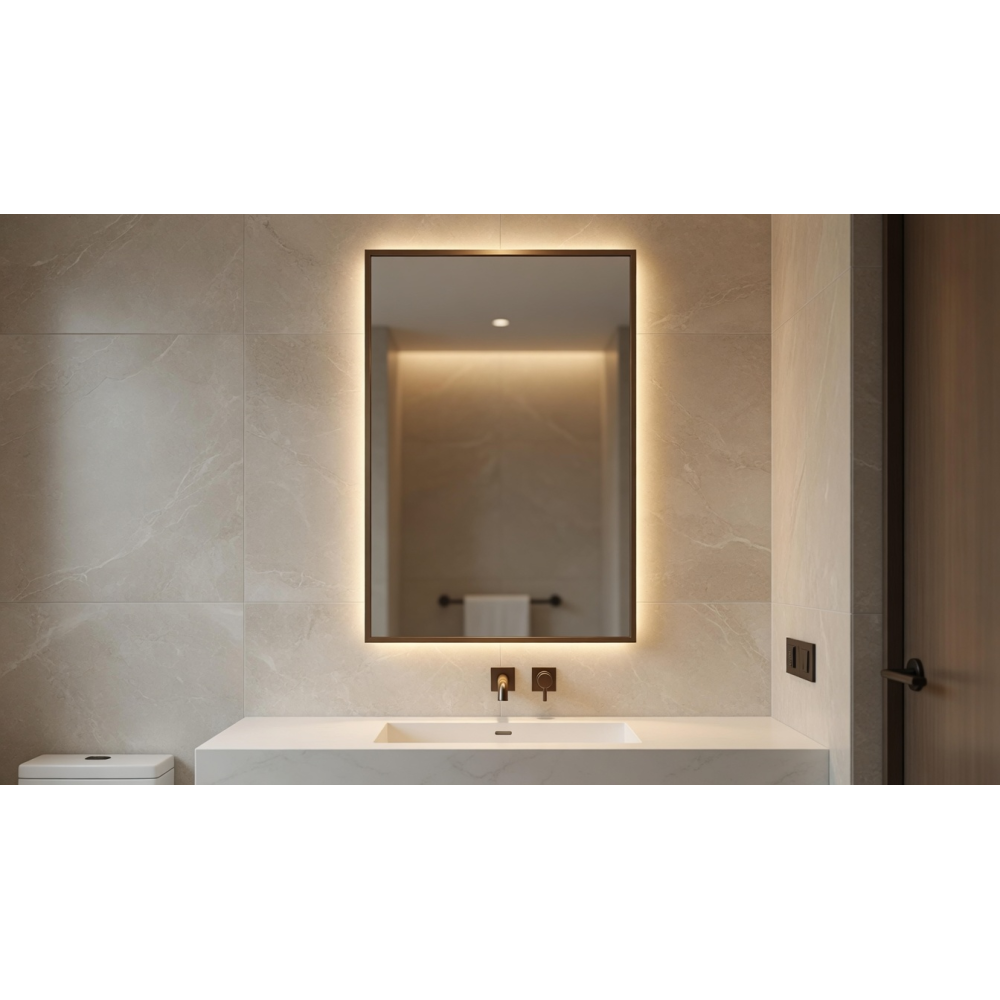 Совет дизайнера: Модель BR002 особенно выигрышно смотрится на фоне стен темных или природных оттенков (серый бетон, темный дуб, изумруд). Для максимального эффекта «парения» рекомендуется выбирать теплый оттенок подсветки, который подчеркнет бронзовый тон зеркала.