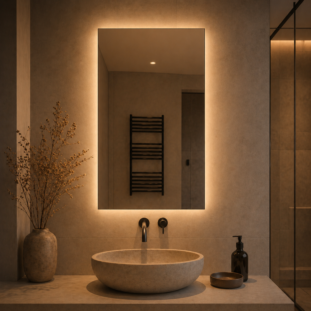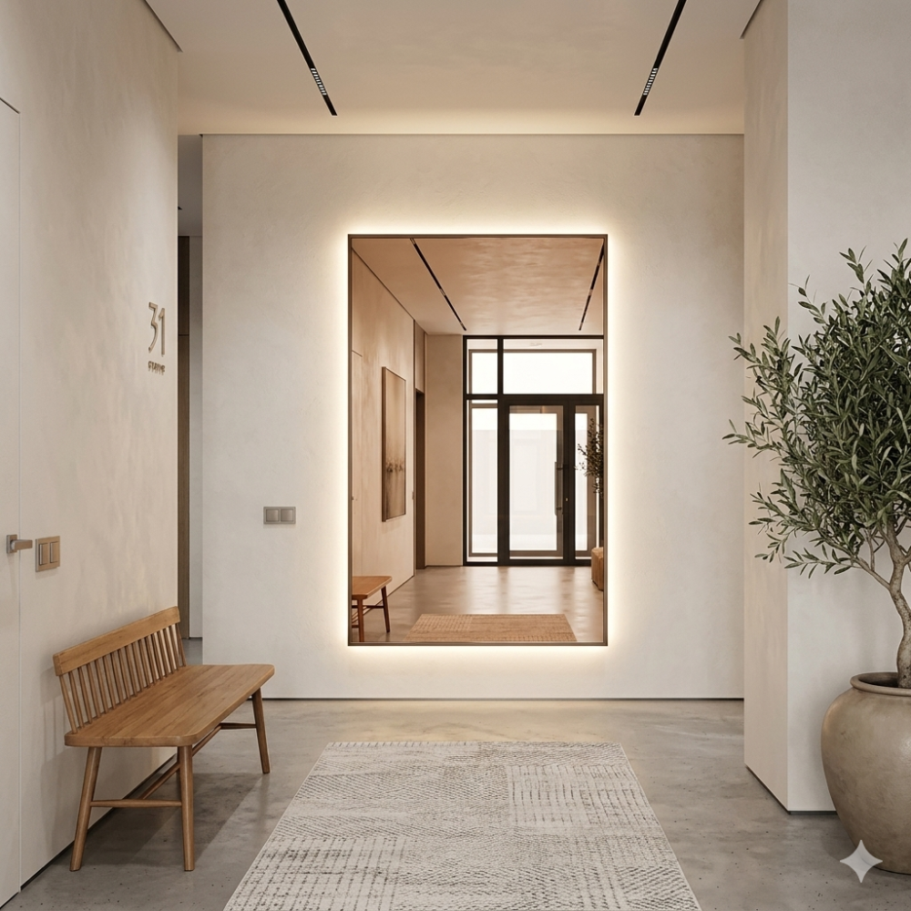 Задняя фоновая подсветка (Ambilight): Светодиодная лента расположена за зеркалом и направлена на стену. Это создает мягкий ореол, который подчеркивает фактуру отделки (камня, декоративной штукатурки или обоев) и визуально расширяет пространство.