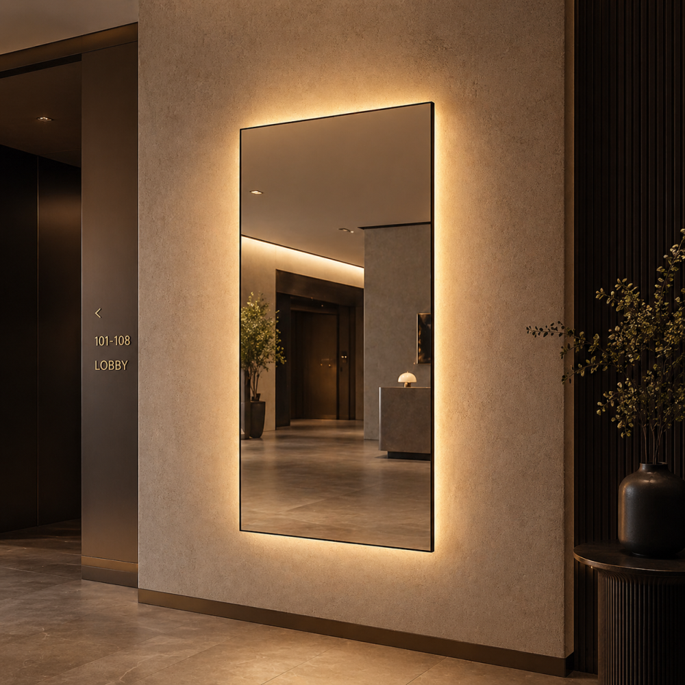 Для профессионального макияжа рекомендуем использовать зеркала с лампочками или зеркала с фронтальными пескоструйными световыми полосами с усиленной яркостью, нейтральным дневным светом и закрытым свечением(сзади зеркала свет не падает на стену).