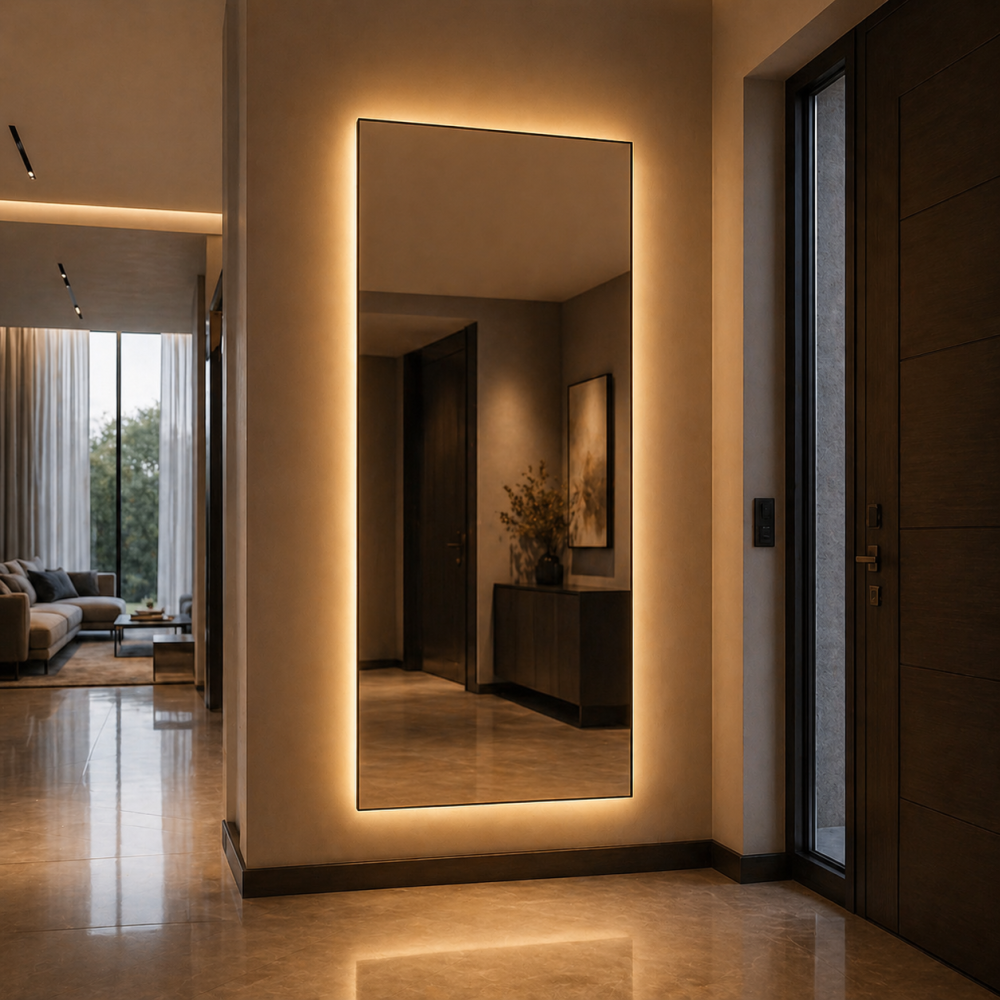 Лаконичный дизайн: Отсутствие видимой рамы делает акцент на чистоте формы и цвете самого полотна, позволяя зеркалу легко вписаться в стили лофт, минимализм или современную классику.