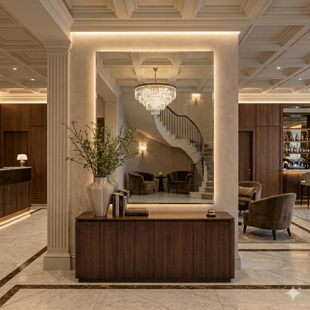 Визуальная глубина: Бронзовое полотно не просто отражает, оно «углубляет» пространство, добавляя интерьеру сложности и статусности.