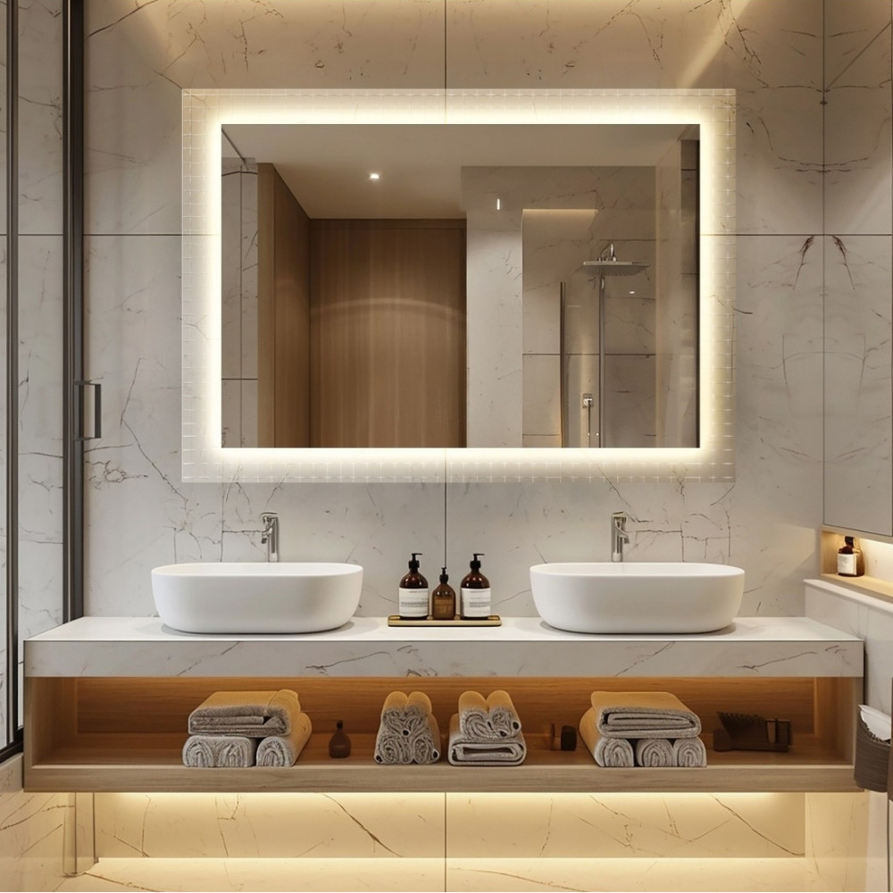 Зеркало AG003 — это воплощение архитектурного минимализма. В этой модели строгость прямоугольных линий встречается с декоративной фактурой стекла и магией контурного освещения. Благодаря многослойной конструкции, оно выглядит как объемная световая инсталляция, подчеркивая безупречный вкус владельца.