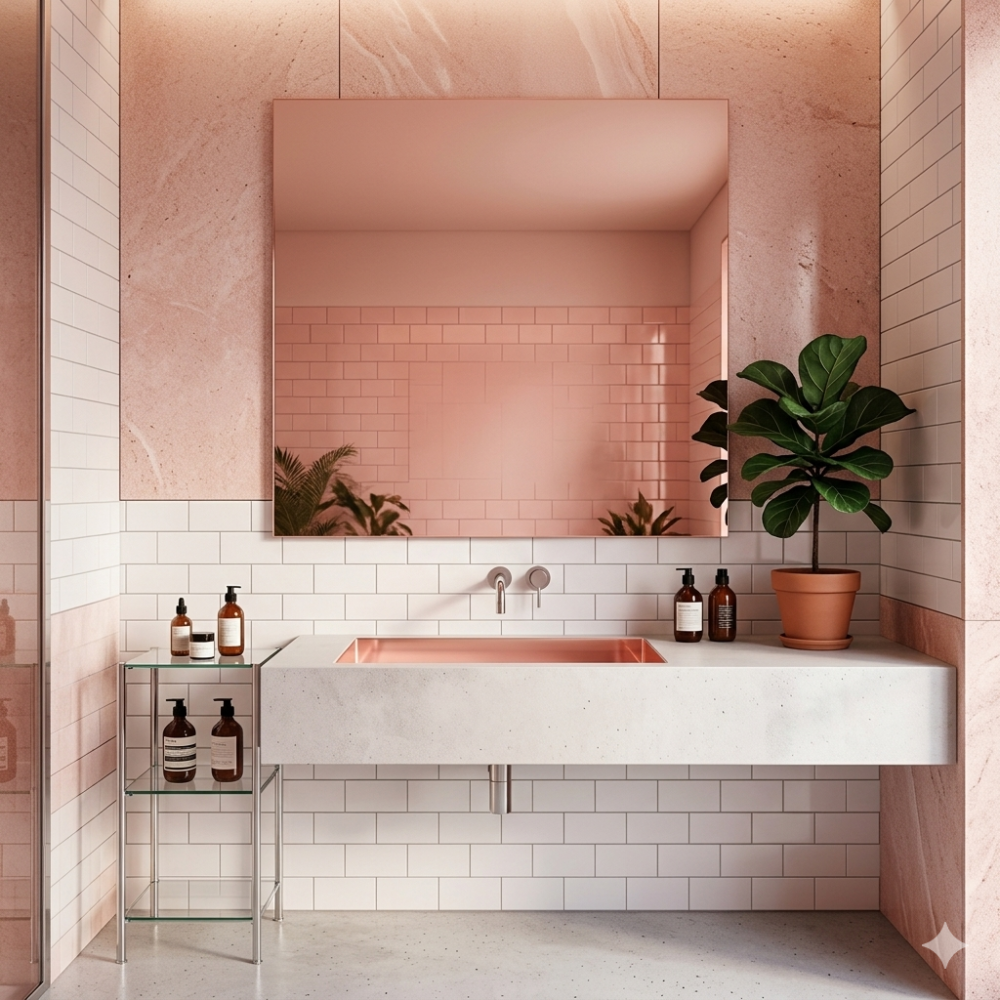 Комбинирование: Розовое зеркало великолепно сочетается с металлами (латунь, золото, медь) и натуральным камнем.