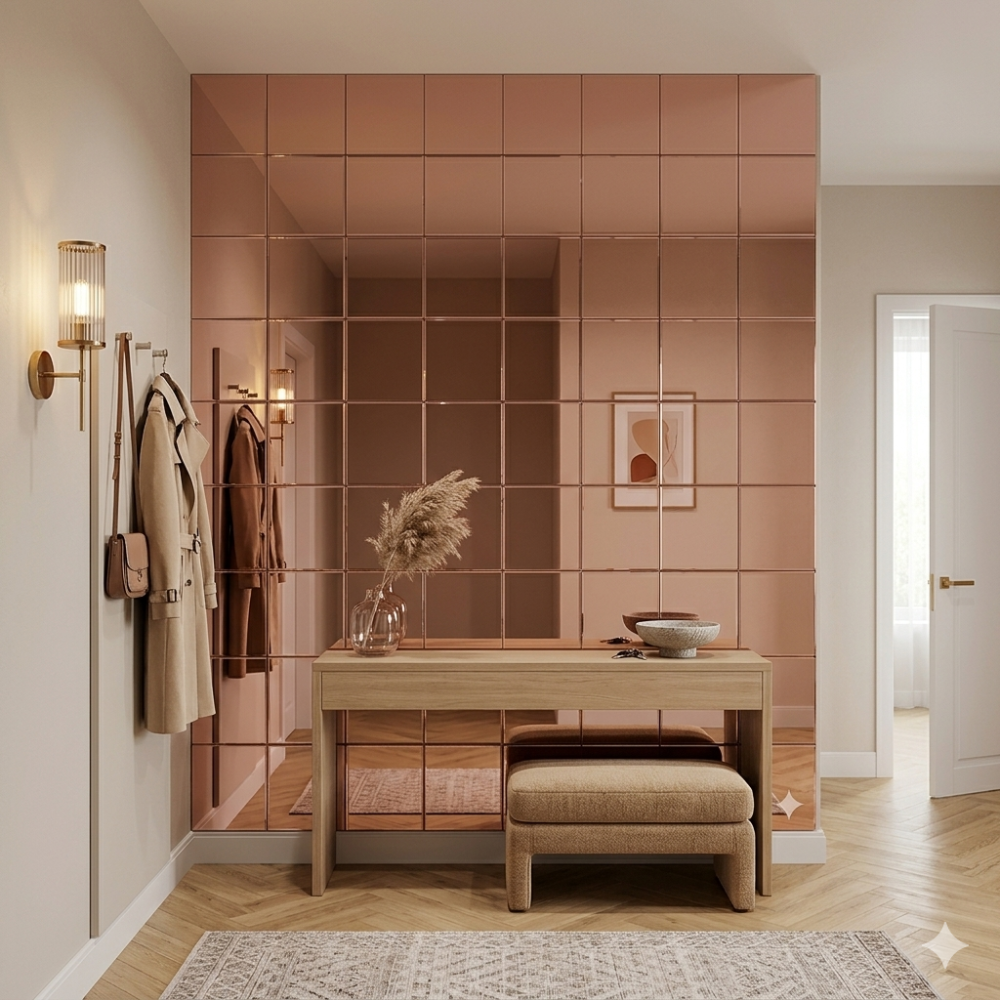 Акцентные стены: Изготовление зеркальных панно или плитки из розового полотна для оформления гостиных или холлов.