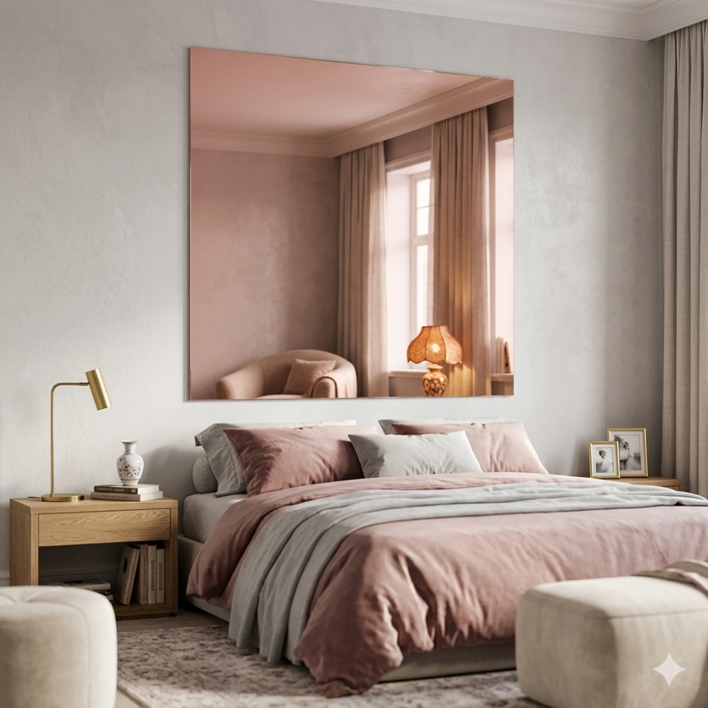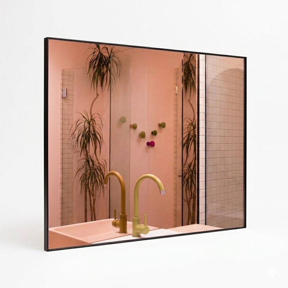 Эффект «фильтра»: Розовый оттенок мягко корректирует отражение, придавая коже здоровый, сияющий вид. Это делает такие зеркала популярными в спальнях, гардеробных и бьюти-зонах.