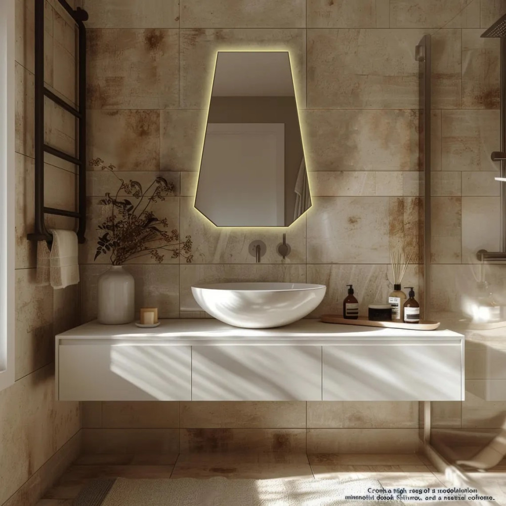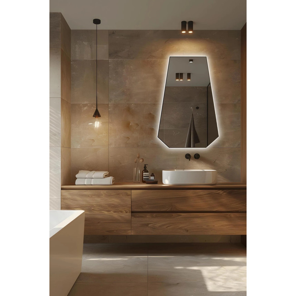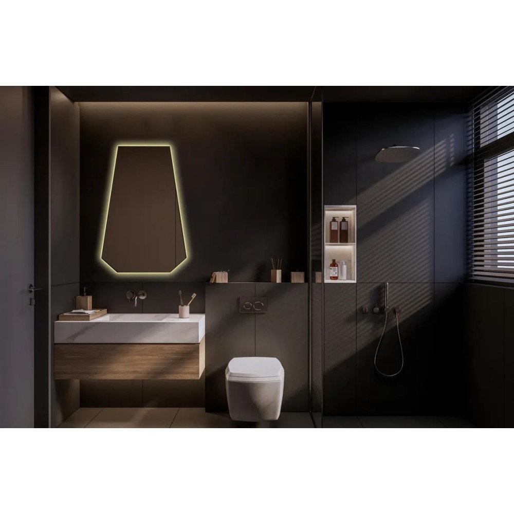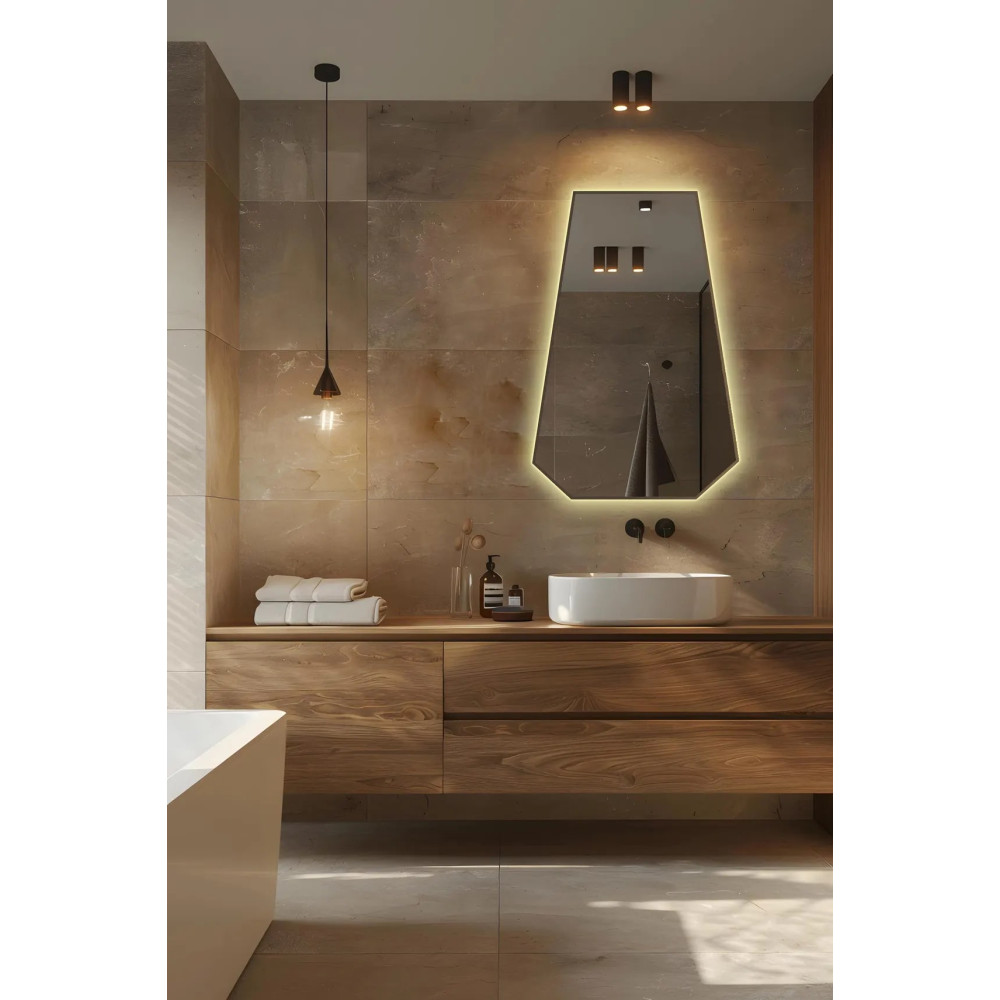 Зеркало E043 — стильное и современное решение для интерьера, в котором ценятся чёткие линии и геометрия. Его шестиугольная форма создаёт выразительный акцент, добавляя пространству структуру и баланс, а задняя фоновая подсветка придаёт зеркалу эффект парения и наполняет помещение мягким рассеянным светом.