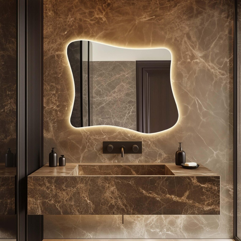 Зеркало E084 — это современный декоративный элемент, который выделяется своей нестандартной асимметричной формой и выразительным световым оформлением. Плавные органичные линии создают художественный силуэт, превращая зеркало в стильный арт-объект, который мгновенно притягивает внимание.