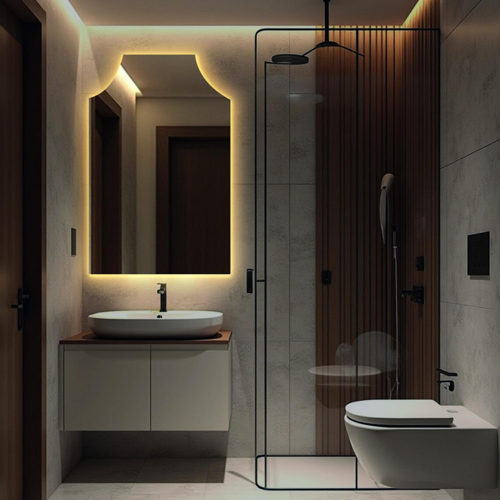 Контурный свет (Ambilight): Светодиоды, направленные на стену, создают мягкий ореол вокруг зеркала. Это не только эффектно выглядит, но и подчеркивает фактуру обоев или плитки, создавая уютное камерное освещение.