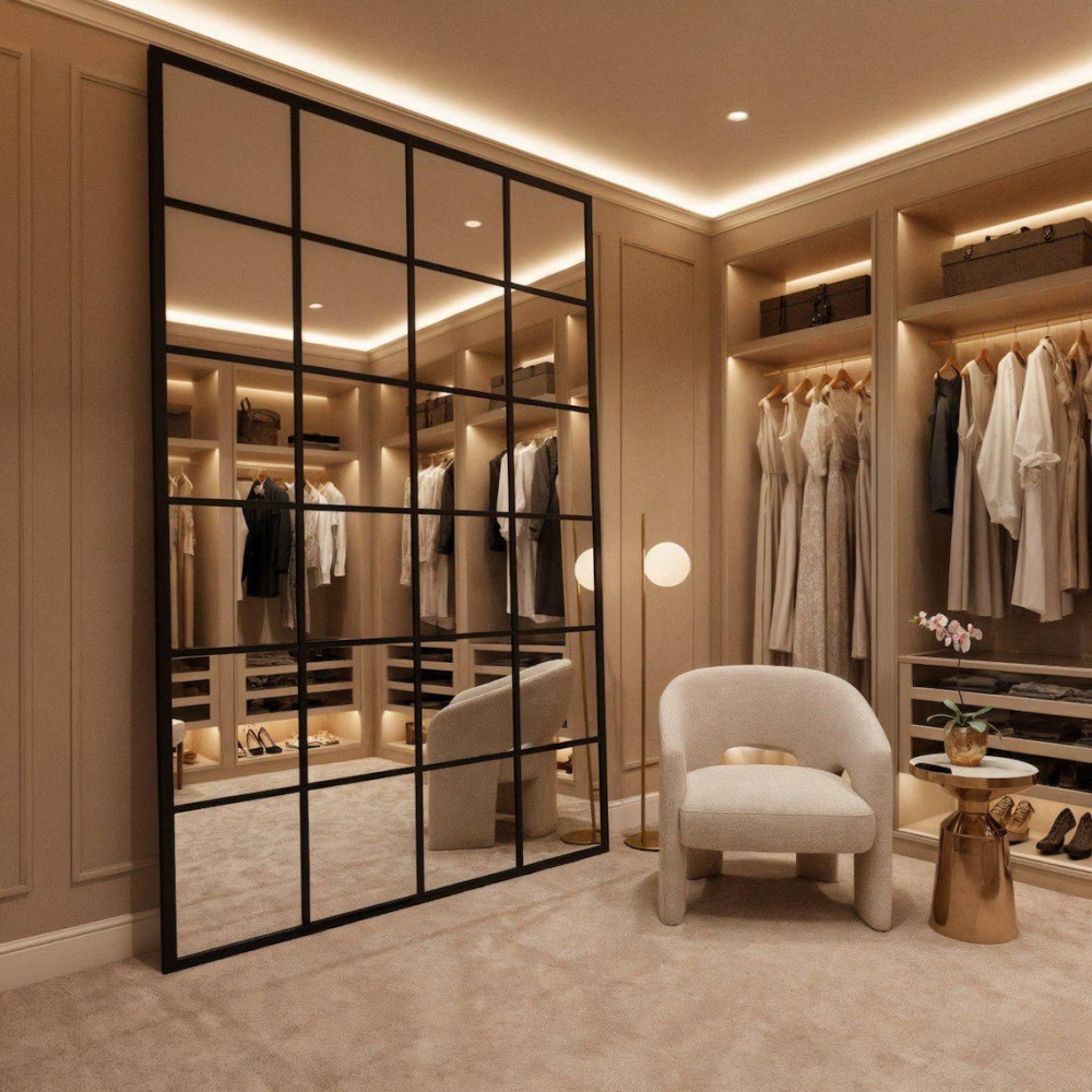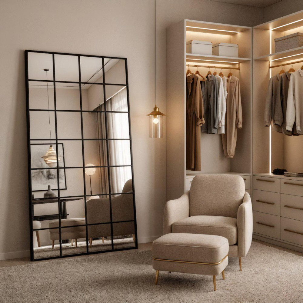 Большое настенное и напольное зеркальное панно с окошками в металлической раме, модель Флетчер.