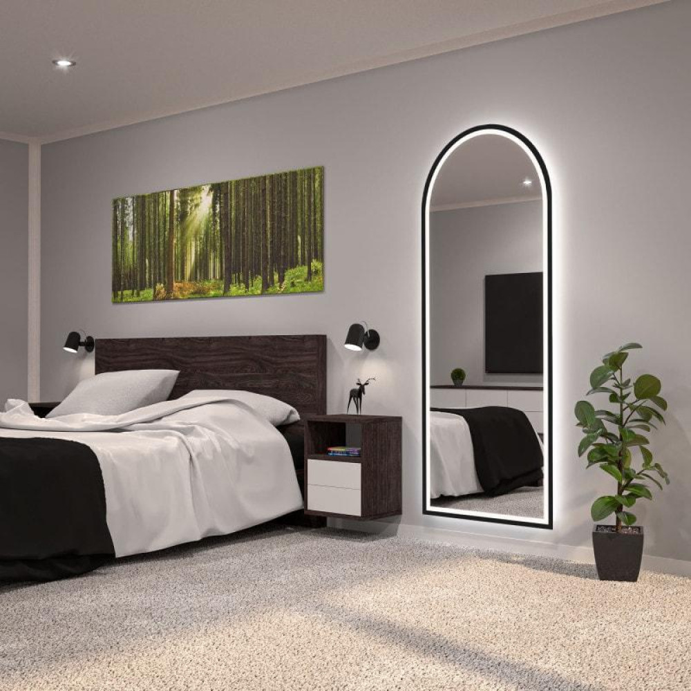 Арочная форма придаёт зеркалу элегантность и визуальную мягкость, а рама из МДФ подчёркивает чёткость линий и аккуратность исполнения. Фронтальная LED-подсветка обеспечивает яркий, ровный и комфортный свет для повседневного использования, макияжа и примерки образов. Задняя фоновая подсветка создаёт эффект «парения», добавляя глубину, объём и атмосферность пространству.