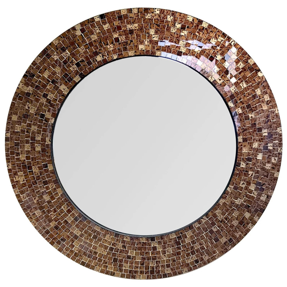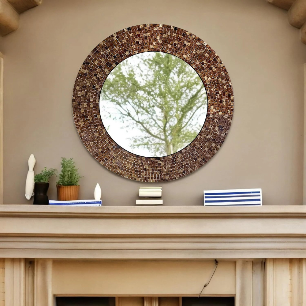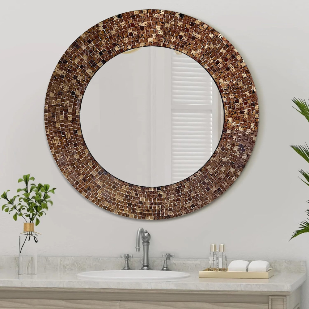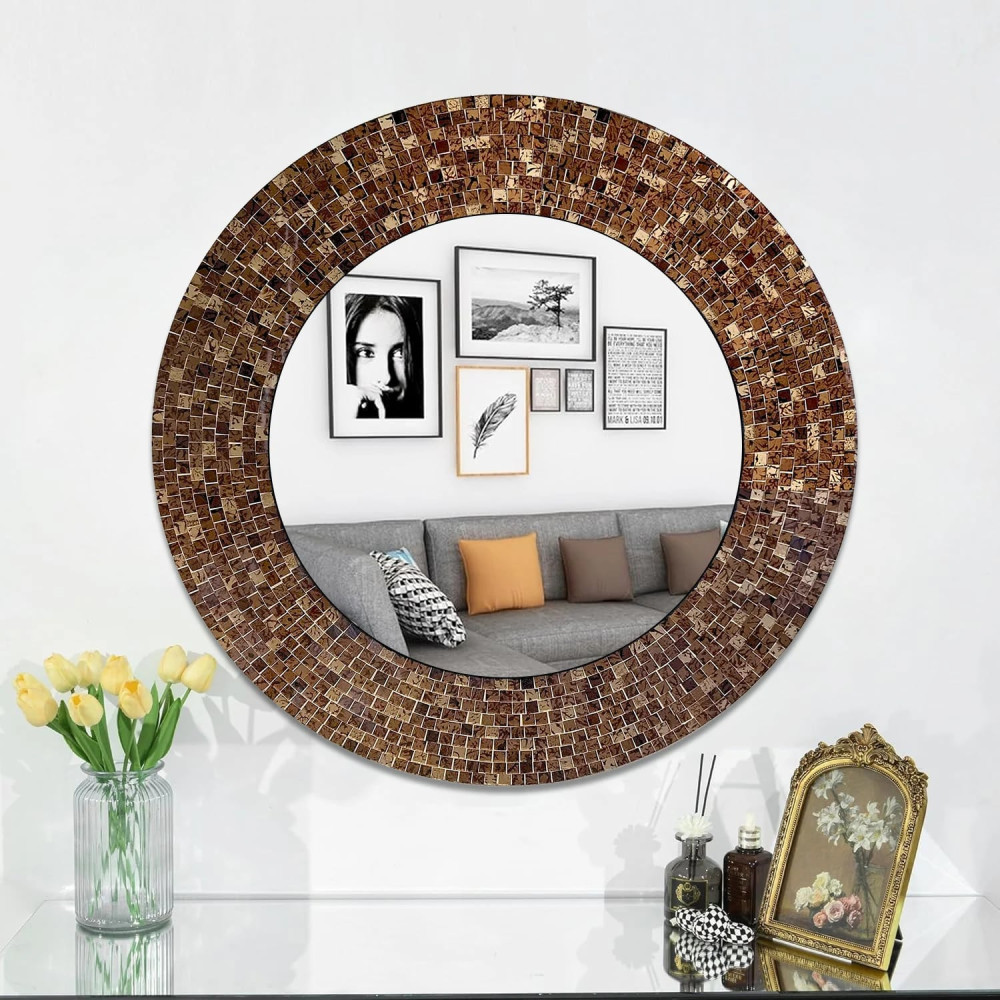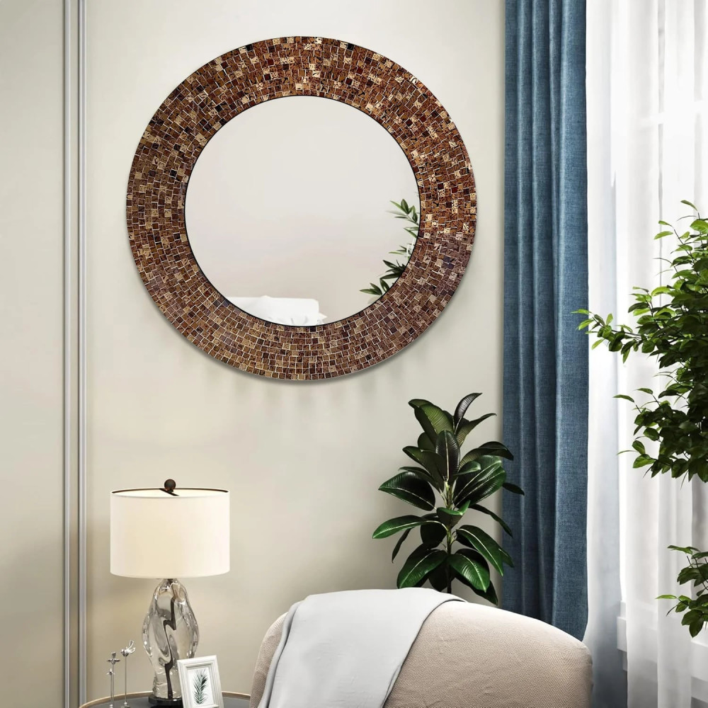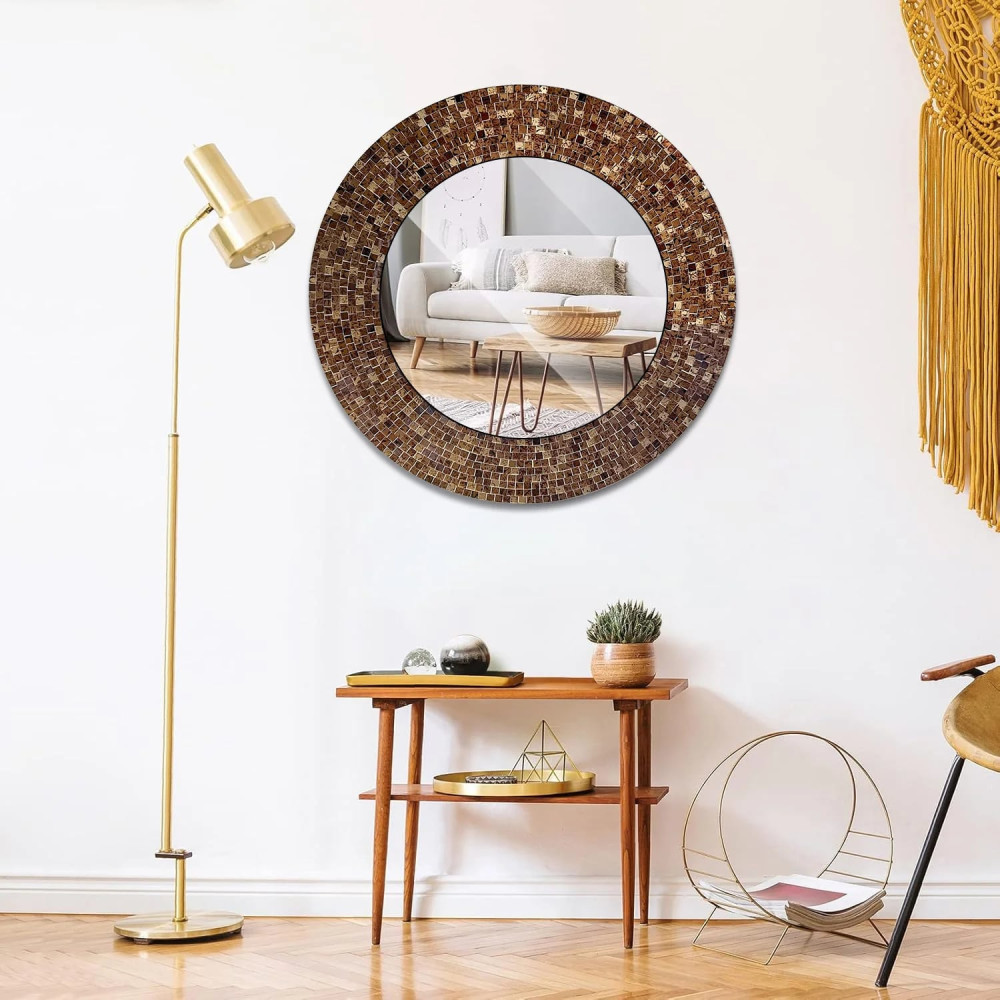 Элегантное зеркало круглой формы в декоративной мозаичной раме станет изысканным акцентом интерьера. Стеклянная мозаика красиво отражает свет, создавая игру бликов и добавляя помещению атмосферу роскоши и утончённости.